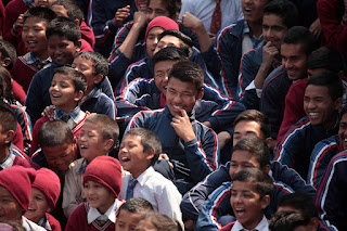 Aufbruch zur nächsten Show. Unser Fahrer bringt uns wieder sicher zum nächsten Auftrittsort. Wir sind immer wieder begeistert, mit welcher Wendigkeit er den großen Jeep durch schmalste Pfade manövriert. Und wenn rechts und links nur 1 cm Platz sind, das Auto passt immer durch. Klasse! Wir spielen in der Child Development Society vor ca. 400 Schülern. Die CDS wurde mit Mitteln aus Deutschland gefördert, u. a. durch starke Unterstützung der Aldi- Stiftung. Bei unserem Eintreffen werden wir von Mr. Surendra Dhakal mit den Worten begrüßt: „Guten Tag, ich bin der Schatzmeister“. Er spricht sehr gut deutsch, hat er doch in Speyer studiert. Wie nett. Wir spielen unsere Show, die am Vorabend diskutierten Veränderungen funktionieren auch beim zweiten Mal, und die Kinder sind begeistert. Danach gibt es intensive Begegnung mit den Kindern (anders als am Vormittag). Die Kinder „entführen“ uns in ihre Klassenzimmer, und wir dürfen auf den Mini-Schulbänken Platz nehmen. Sehr witzig. Die Klassenlehrerin der 5. Klasse ist blind, war dennoch sehr begeistert, von dem, was sie gehört hat. Sie hat sich erkundigt, wieviele Clowns aufgetreten sind. Viele schöne Begegnungen, ein schöner Tag, zwei sehr schöne Shows. Arne