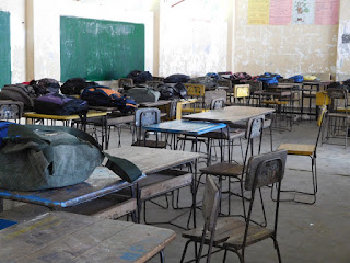 Dieses Mal ist der Chemieraum der Schule unser Backstage. Während wir uns umziehen sammeln sich 380 Kinder, die zum Teil heute ihren ersten Schultag haben, in der kleinen Halle und erwarten uns schon, als wir mit unserer Anfangsmusik über den Sandplatz zu ihnen hinüber wandern….