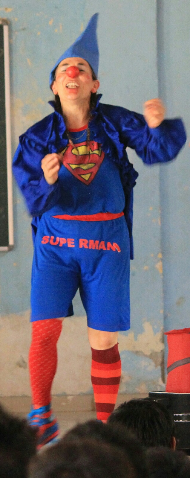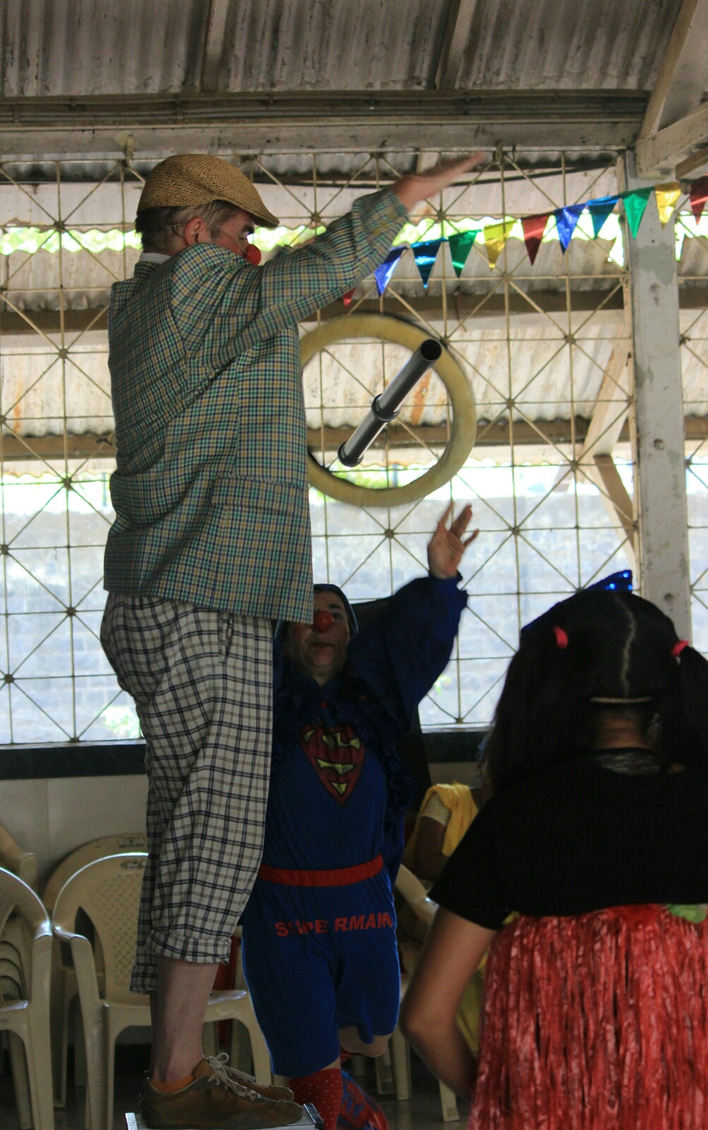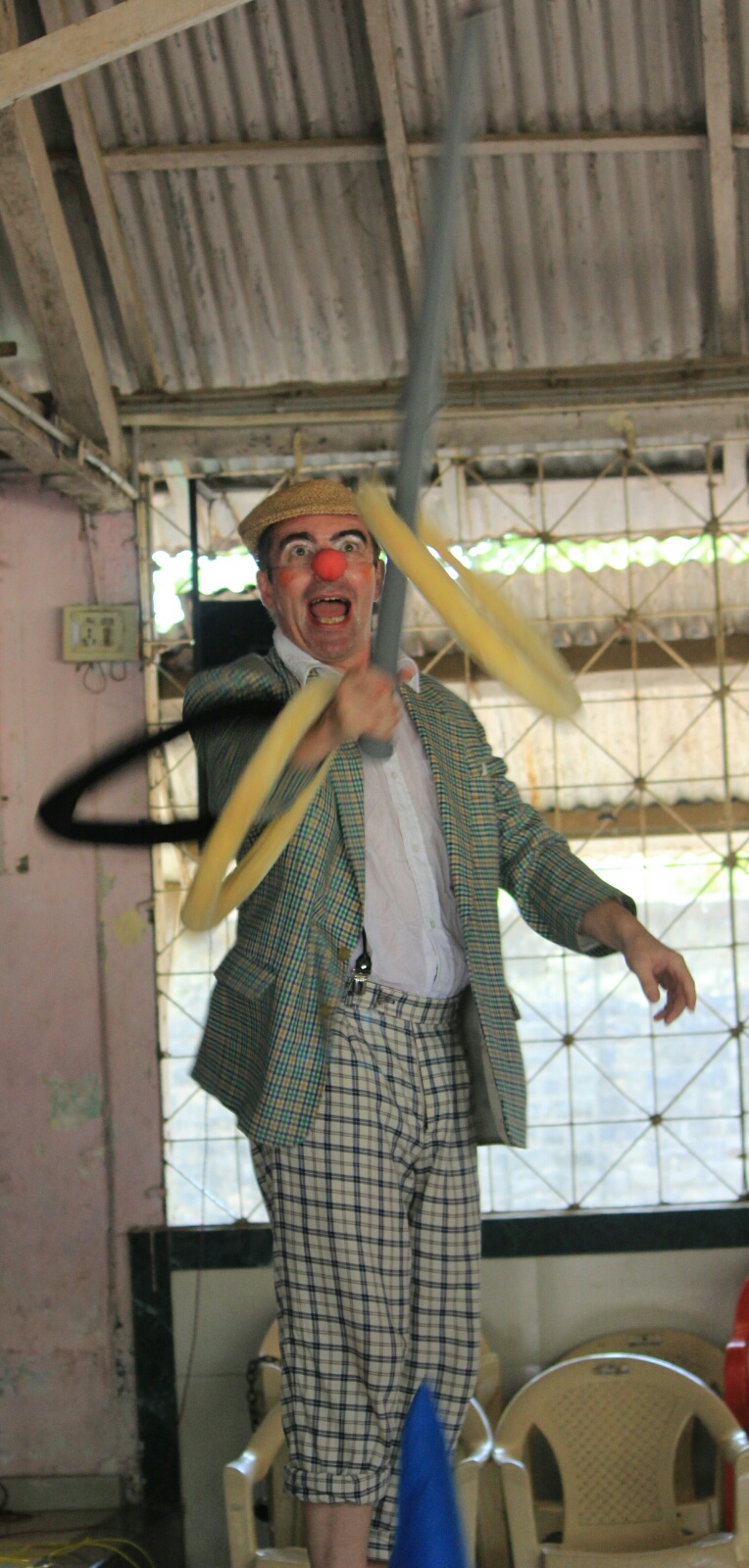 Gestern spielten wir wieder in einer Institution der Children’s Aid Society Mumbai. Dort leben ausschließlich Jungs, aller Altersstufen, Waisen und straffällig gewordene Jugendliche. Circa 150 Jungs verfolgten brav sitzend unsere Darbietung und ungefähr 50 weitere Menschen, drumrumstehend. Im Anschluß zeigten 10 der Jungs ihre eigene (ohne Anleitung oder Vorbild) einstudierte Choreographie zu einem beliebten indischen Hit. Es war umwerfend, mit welcher Hingabe sie ihren Tanz präsentierten, mit akrobatischen Anteilen, und natürlich wollten die Clowns das auch lernen, bekamen ihre Chance, die sie grandios in den Sand setzten, denn so cool wie die Jungs kann natürlich kein Clown smurfen, grooven, hip-hoppen. Selten hat sich-auf-der-Bühne-blamieren so viel Freude gemacht ...