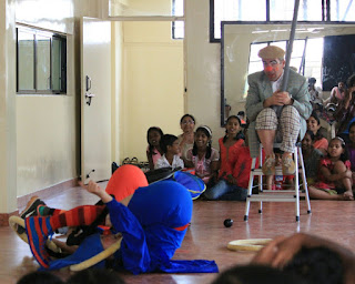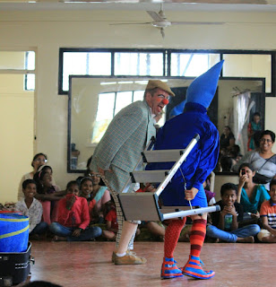 Wir folgen der Einladung zu Soonrita’s Haus. Sie hat auch am Workshop teilgenommen. Ihre Mutter ist Lehrerin in den ländliche Gegenden, entwickelt einfache und bezahlbare Möglichkeiten, die vielen eigenen Stammessprachen (vor 2 Jahren wurden 1500 lokale Sprachen gezählt, zuletzt nur mehr 750) zu erhalten und trotzdem Zugang zur offiziellen Sprache und Kultur überhaupt zu bekommen. Wir haben intensive Gespräche über Schule, Erziehung, Lernen und Lachen. Schließlich geben wir in einem angemieteten Tanz- und Sportcenter eine herrliche Show für einige der Gruppierungen für die Soonrita und ihre Mutter verantwortlich zeichnen, ca 80 Kinder, 20 Erwachsene. Eine wunderbare Frage- und Antwortrunde nach der Show beenden den Nachmittag, und natürlich muß es auch noch eine Abschiedsrunde geben, bei der jede/r die Clowns nochmal persönlich treffen mag.