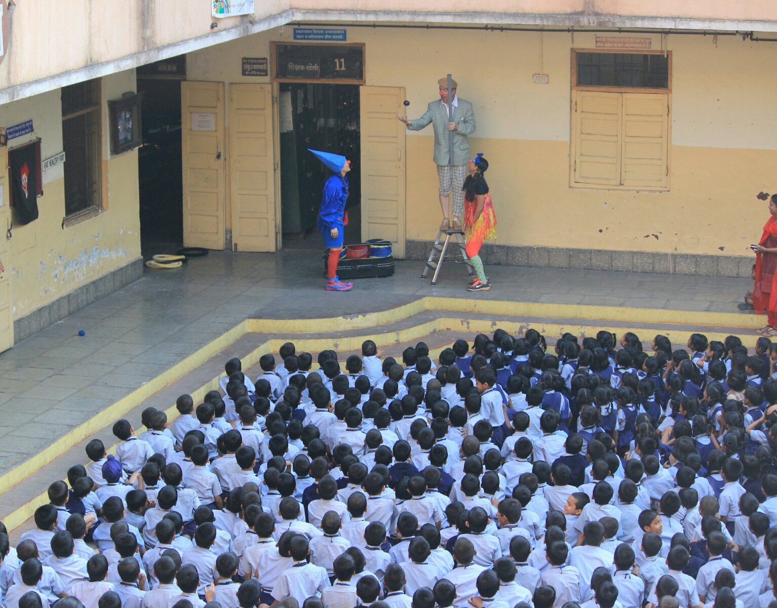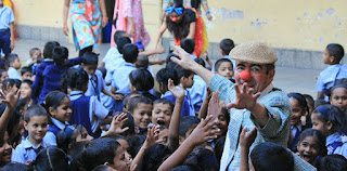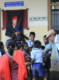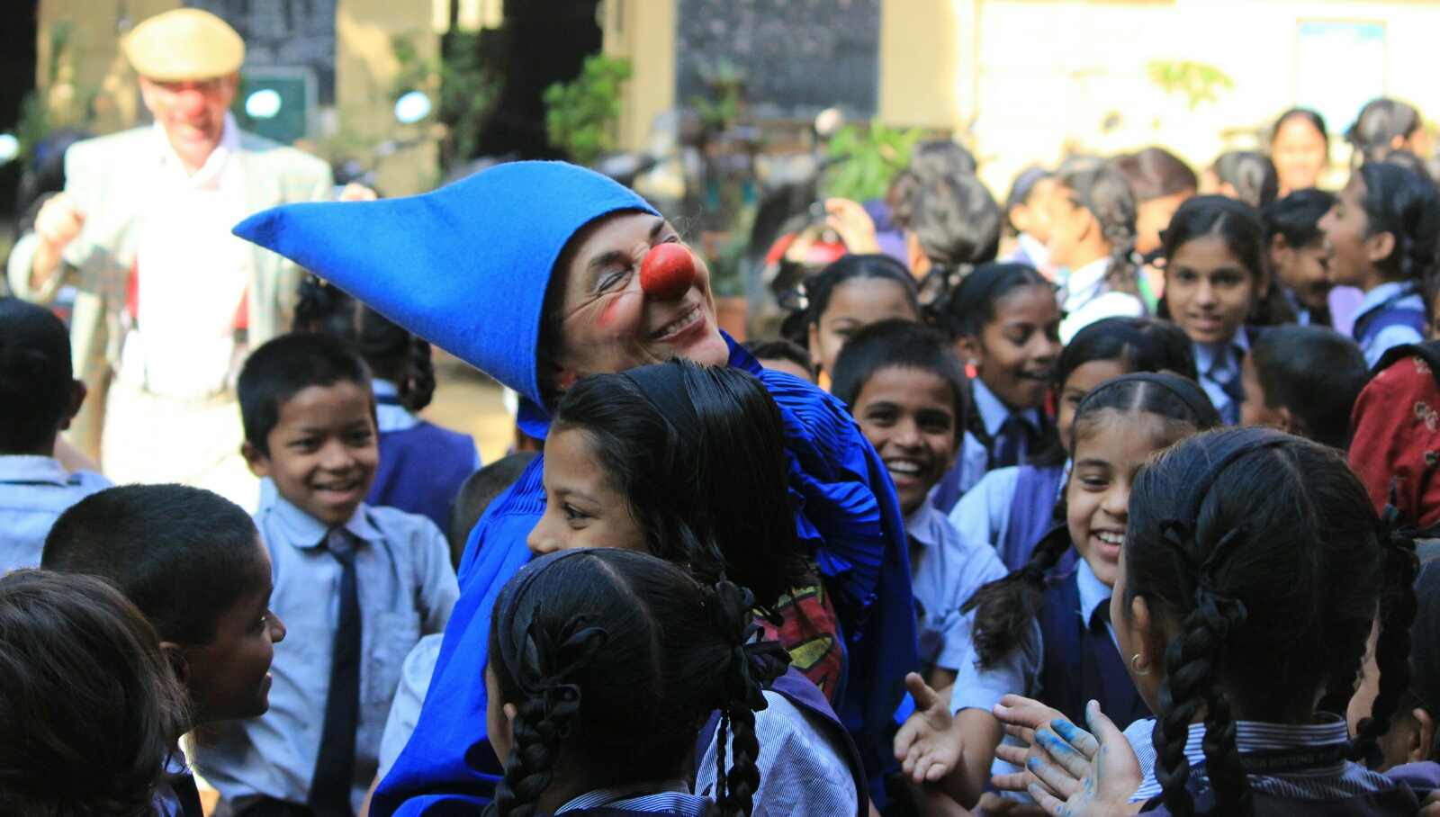 Heute morgen spielten wir auf dem Schulhof der Utkarsha English Medium School. Ca 400 Kids waren da, und von allen Balkonen rundrum schauten Lehrer und Praktikant/Innen zu, auch die Direktorin. Alle hatten ihren köstlichen Spaß, und hinterher gab’s noch ein kurzes Bad in der Menge. Es ist beeindruckend zu sehen, daß die Begeisterung entfesselt, die Kinder aber in der Lage sind, sofort wieder achtsam zu sein, wenn jemand fällt und überrannt zu werden droht. Alle möchten den Clowns noch persönlich begegnen, die anstehenden Prüfungen verhindern die Ausdehnung unsres Besuches. Wieder wird herrlicher, unfassbar süßer Tee und köstliches Samosa gereicht, Susie verzichtet lieber zu Gunsten ihrer Magenkonsolidierung. Wir treffen noch kurz die Direktorin, die sich herzlich bedankt, und hofft, daß wir wieder kommen werden.