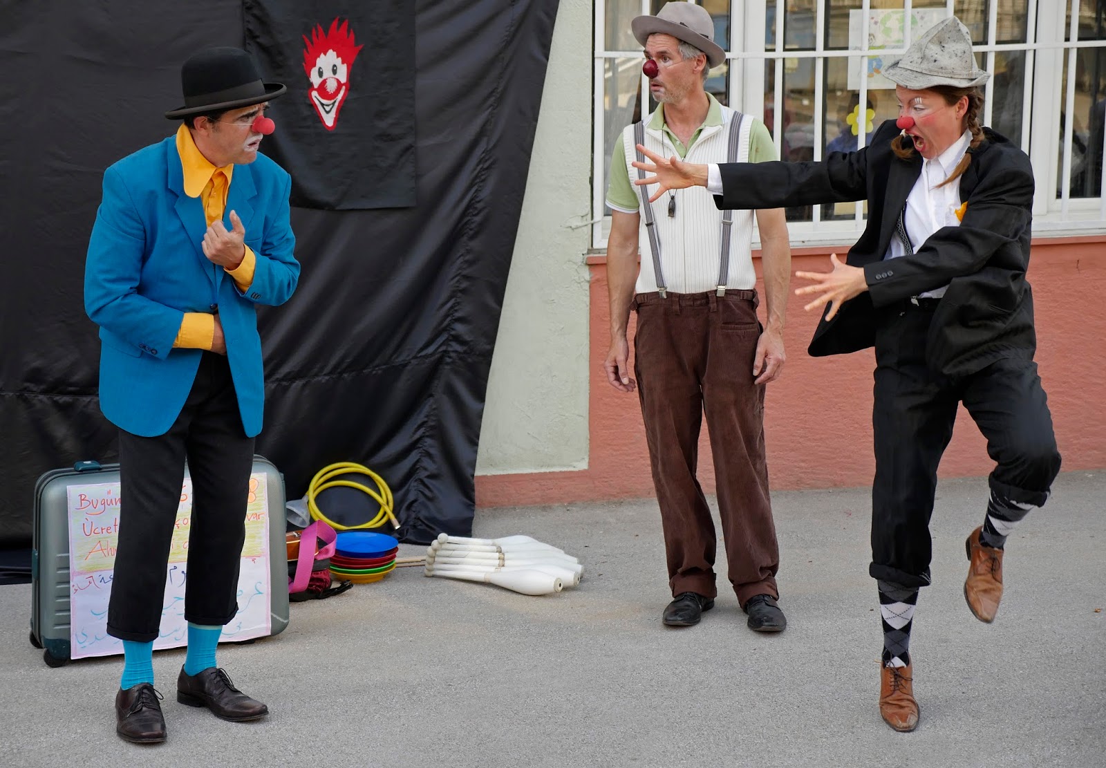 Als wir nachmittags einen Walk-Act durch das Viertel machen, haben wir ein Plakat an den großen Koffer angebracht, auf dem in türkisch und arabisch unser Auftritt unweit von hier in einem Schulhof angekündigt wird. Der clowneske musikalische Umzug mit Jonglage durch die Strassen und Gassen ist ein voller Erfolg. Viele erstaunt erfreute Augen und Gesichter, schmunzelnde alte Männer, Fenster öffnen sich, Kinder und Erwachsene kommen auf die Balkone, auf die Strasse, Fotos werden gemacht…damit hatten wir nicht gerechnet. Nach etwa einer Stunde beenden wir verschwitzt unser Treiben.
