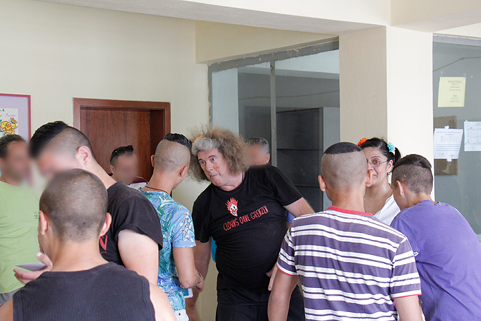 In der Gefängnisaula werden Bänke rundherum aufgebaut. Heiko wollte gerne dass die Sitzgelegenheiten direkt vor unserer Spielfläche stehen. Die Wärter wiegelten jedoch ab. Ein Sicherheitsabstand ist erforderlich. Es sind 44 Insassen und 19 Wärter/in und 5 Zivilisten die unsere Show anschauen.