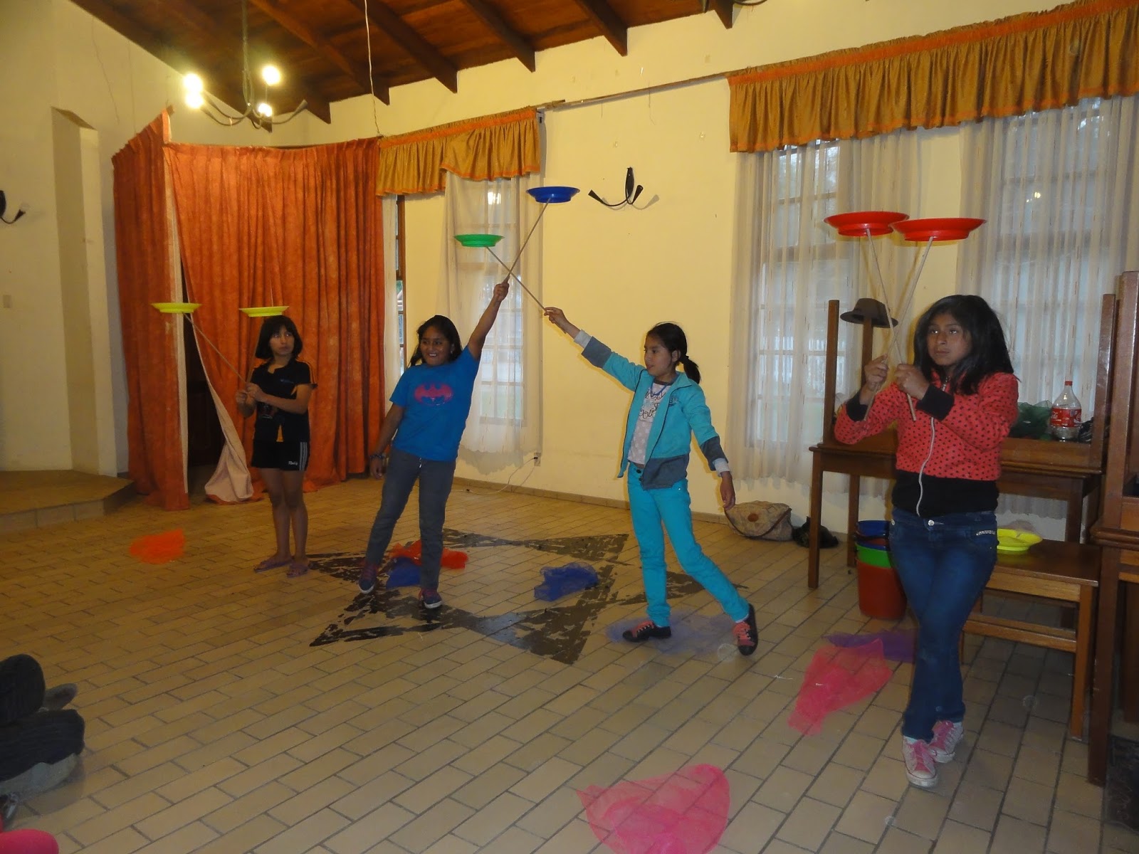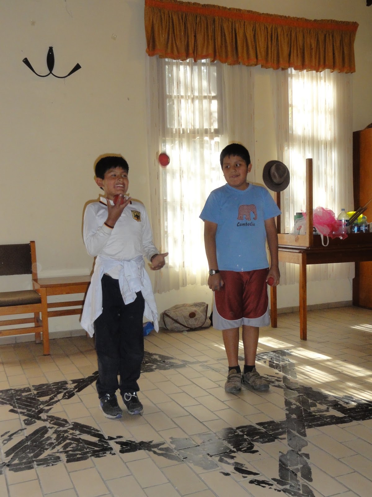 Um 15 Uhr kamen die  ersten Gruppen und wir beschlossen, dass wir uns alles der Reihe nach anschauen wollten, um zu sehen, was sie so erarbeitet haben. Also trat jede Gruppe mal auf und wir machten Verbesserungsvorschläge: Kontakt zum Publikum aufbauen, in dem man immer wieder mal sie direkt anschaut, sich Gegenseitig helfen, wenn mal ein Trick nicht klappt, Verbeugen und Applaus abholen und und und. Um 16 Uhr und um 17 Uhr verlief es ebenso. Bei diesen kleinen Präsentationen wurden wir besonders von einigen wenigen überrascht. Besonders von einem Jungen, der David heißt, 15 Jahre. Während der letzten Wochen hatte ich von ihm immer wieder den Eindruck, dass es ihm voll peinlich ist, bei den Clowns mit zu machen. Kann ich verstehen, denn in der Pubertät ist einem so manches peinlich und ein Clown haut auch noch oft in diese Kerbe rein. Wir haben irgendwann letzte Woche gefragt, wer denn kein Clowns-Workshop mehr machen möchte, da wir niemanden zu etwas zwingen wollen, und bis auf 2 von 35 Kinder und Jugendlichen wollten alle Clowns sein. Aber David schlurfte trotz Nachfragens weiterhin peinlich berührt vor sich hin und machte die Übungen mit gesenktem Kopf. Immer wieder sagten wir ihm, dass es ok sei, wenn er das absolut nicht machen möchte. „Nein, nein, ich will ja!“