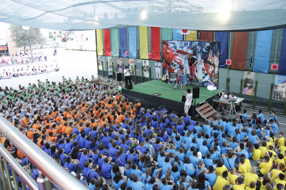 Der erste Tag des diesjährigen Don Bosko Sommercamps und wir mittendrin. Kurz vor Showbeginn liefen noch Mannschaftsspiele und die Musikanlage mit einem Supersound. Die 700 Kinder und Jugendlichen wurden immer wieder mit Schlachtrufen auf Ihr Camp eingestimmt. Der Leader sagt etwas durchs Mikrofon und die Masse ist Muchs Mäuschen still. In diesem Soundloch spielen wir auf. Lalalalalalalala la La und wir erreichen sie alle. Was für ein Kulisse, aber seht selbst.