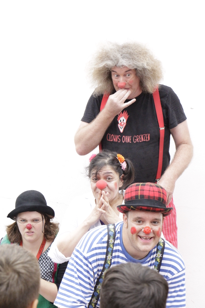 Als wir mit unserer Show anfingen, kam noch eine Kindergartengruppe hinzu. Die eine Hälfte der Kinder war gepflegt und sauber, und die andere Hälfte hatte wirres zerstrubeltes Haar, dreckige Klamotten und keine Schuhe an. Aber beide Hälften verfolgten gespannt unsere Show. Sie begrüßten uns lautstark, sie lachten mit uns und waren verzaubert, als Heiko „unsere Prinzessin“ einen Luftballon einfach so mal schluckte.