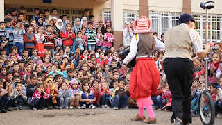 Unser erster Auftritt heute also in der neuen Schule Al Amal, die Barada vor einem Jahr am Stadtrand von Demiküprü eröffnet hat (Anmerkung von Miriam: hier wurden wir von den Grünhelmen an unserem letzten Tag zum Richtfest eingeladen), direkt an einem netten Fluss gelegen, dessen Namen ich vergessen habe, der vom Libanon daherkommt oder dahinfließt. Weiß ich auch nicht mehr. Wir spielen auf dem Schulhof, der noch eine holprige, lehmige, eingezäunte Brachfläche ist, die aber natürlich im weiteren Ausbau asphaltiert, mit Bäumen bepflanzt und mit Beeten ausgestattet werden soll. Aber für diesmal war der Boden eine krasse Herausforderung für die Hochradnummer.