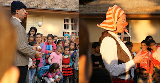 Anschließend ging es mit zwei Pkws weiter nach Kumla, zu unserer größten Schule bisher. Wieder eine Show, auf dem diesmal asphaltierten Schulhof, mit etwa 500 begeisterten Zuschauern. Immer wieder kam es zu kürzeren Unterbrechungen, weil die Lehrkörper ihre Schützlinge, die uns immer näher auf die Pelle rückten, wieder auf Distanz schieben mussten. Wir haben deshalb ein bisschen gekürzt und so wurde es ein recht knackiges Event. Anschließend durfte ich den Herrn Direktor auf die Backe küssen und es gab Nescafé mit Milch und Zucker im Rektorenzimmer, wo das Rektorentöchterchen am Dienstcomputer spielte, und einen Schokowaffelriegel und ein Silikonkaugummi ohne Geschmack zum Abschied .