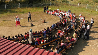 Weil wir mittlerweile unseren Bühnenvorhang bei einem unserer zahllosen Gastspiele verloren, vergessen oder vergrault haben und auf der weiten Fläche eh keine Möglichkeit wäre, ihn aufzuhängen, hatten wir die Idee, dass wir die Kinder damit beschäftigen, aus den kleinen Feldsteinen einen Bühnenkreis zu legen, um einerseits eine Spielfläche zu definieren und andererseits die Kinder noch einen Augenblick beschäftigt zu haben, um unsere Showvorbereitungen ungestört zu Ende bringen zu können.