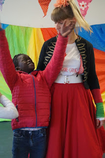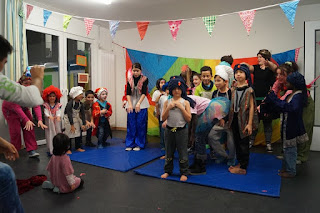 Glitzer, Tüll und Schminke sowie ein buntes Schwungtuch als Vorhang und Wimpelfähnchen mit Glöckchen, zauberten letzte Woche aus einem Gemeinschaftsraum unsere Manege! Die Luft flirrte vor Aufregung denn der große Moment war gekommen: Gemeinsam begannen wir einen ganz besonderen Nachmittag in der Gemeinschaftsunterkunft. Was in den letzten vier Wochen von den Kindern erarbeitet wurde, wird nun vor dem fast ebenso aufgeregten Publikum präsentiert.