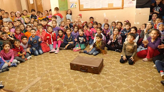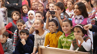 Ca. 450 Kinder warteten dort in einem großen Klassenraum. Die Luft war stickig. Wir hatten nur kurz Zeit unsre Sachen herzurichten, wir schwitzten bereits ohne Ende. Bevor wir auftraten fing ein Chor an zu singen. Wir wurden gebeten herein zu kommen. So startete unsre letzte Show mit einem wunderschön vorgetragenen Lied aus Syrien. Es wurde getanzt, der Musiklehrer stand vorne mit Trillerpfeife, wir gingen dazu, ich tanzte mit, es war so schön. Welch ein Kontrast zu der anderen Schule nebenan, nur 15 Minuten zuvor.