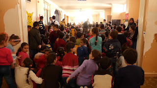 Kurz hatte ich Sorgen, dass auch hier so eine vor Überfreude ausbrechende Panik entstehen könnte. Die Lehrer hatten die Kinder jedoch viel besser im Griff, mussten jedoch wieder etwas abkürzen, auch aufgrund des Geräuschpegels, des wenigen Platzes und der kaum noch vorhandenen Luft im Raum.