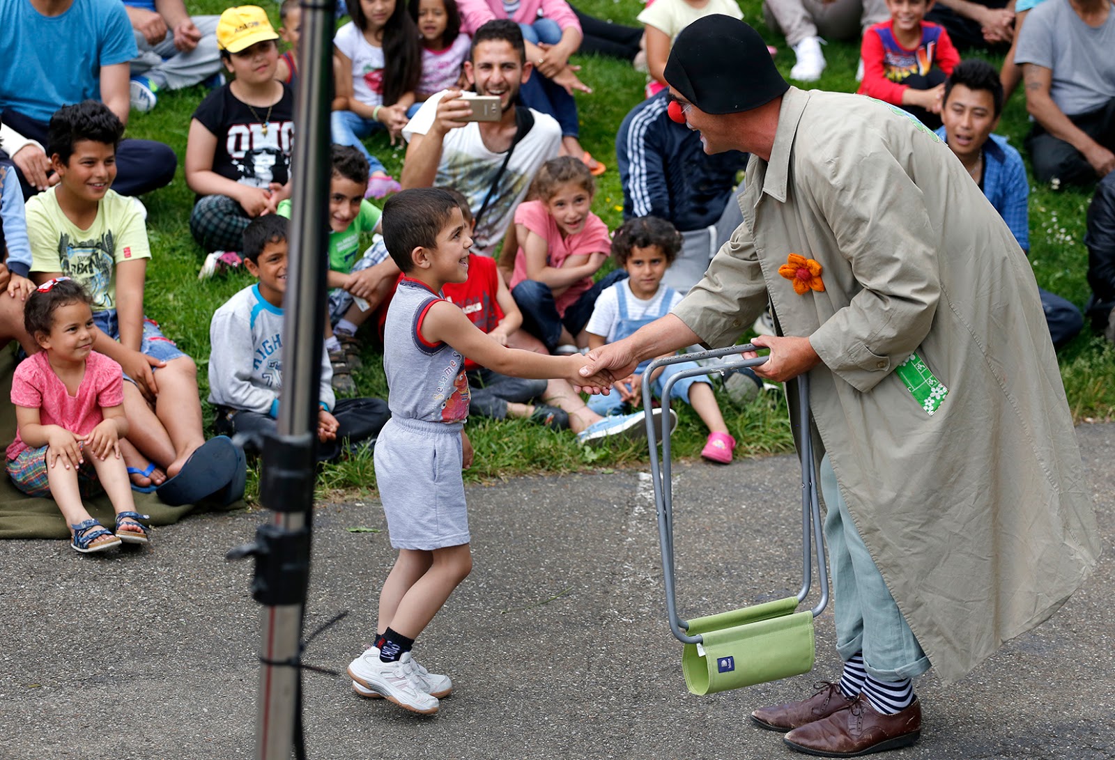 Die LEA in Meßstetten ist ein ehemaliges Kasernengelände, das seit Oktober 2014 für Flüchtlinge bereitgestellt wurde. Momentan befinden sich etwa 1200 Asylsuchende dort, darunter etwa 200 Kinder; viele aus Afghanistan, Syrien, Eritrea. Schon als wir ankommen, sitzen viel draußen in der Sonne und winken uns zu. Ein passender Platz für die Show ist schnell gefunden: die Bühne bauen wir auf dem großen zentralen Parkplatz auf, das Publikum kann sich davor auf dem Rasen gut ausbreiten. Außerdem steigt das Gelände leicht an, was dem Ganzen eine gewisse Theateratmosphäre verleiht. Schon eine Stunde vor Showbeginn ist eine Riesenstimmung. Und so viel Publikum hatten wir noch nie! Bestimmt 500 Leute sind gekommen, die Kinder hocken auf unseren mitgebrachten Decken.