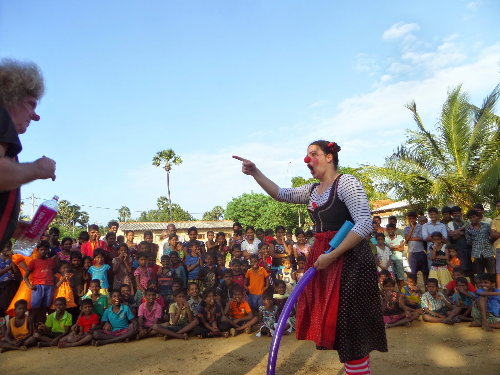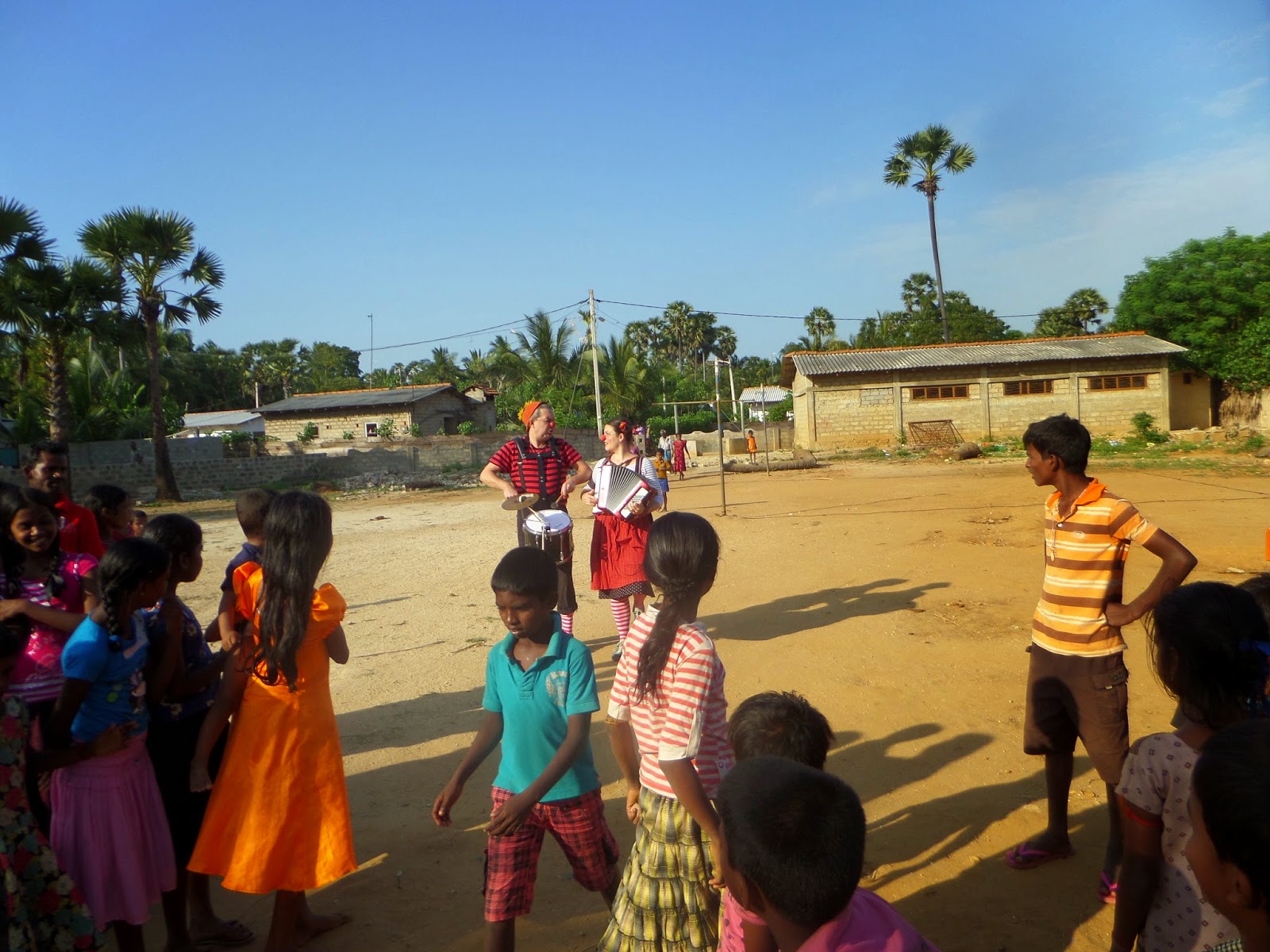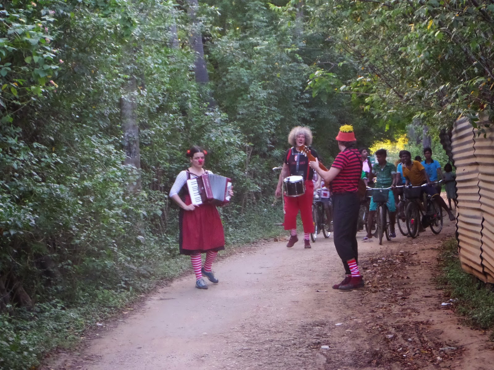 Angezogen von der Musik werden aus ca. 100 bald 300 Menschen! Wir spielen vor vielen großen Kinderaugen die halb den Mund aufhaben oder nur unglaublich begeistert kucken! Aber genauso wie die Kinder findet man immer wieder Erwachsene Augen die sich unser Treiben freudig und schmunzelnd anschauen! Nach der Show bleiben wir noch und spielen mit den Kindern. Einige haben uns einen Tag davor schon in einer Schule gesehen und sprechen uns mit Namen an oder machen Sachen nach die wir Gestern gezeigt haben.