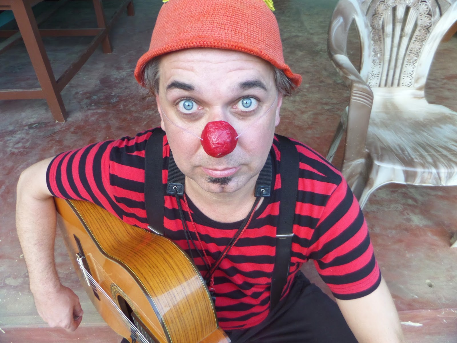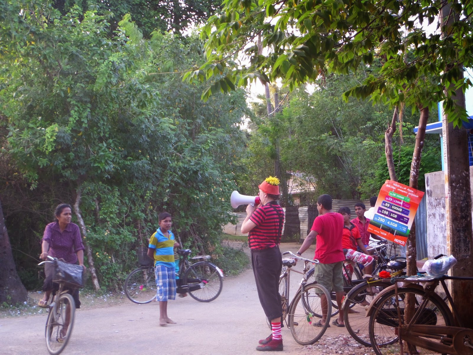 Im Kostüm geht’s dann auch gleich weiter zur nächsten Location durch kleine enge Strassen. Schon fast im Urwald landen wir dann an einer kleiner Kreuzung. Kiosk und daneben eine kleine Kirche mit einem Ansatz von Bühne, dies soll unser zweiter Spielplort heute sein. Von weitem hört man sowas wie ein Megaphon und so ist es auch…..zwei Jungs auf dem Fahrrad treiben die umlebenden Menschen zusammen. Kurze Hand schnappt sich Popo das Phon und trommelt auch noch mal kräftig auf die Werbetrommel.