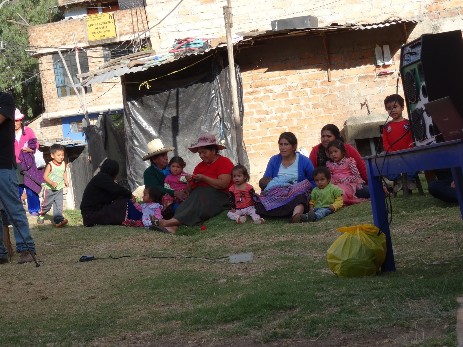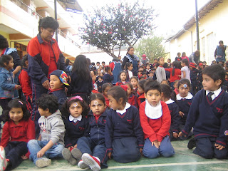 Nach circa 15 Minuten Fußweg (unsere Sachen hatte Christa im Auto gefahren) erreichten wir den Kindergarten „Santa Teresita“. Kinder zwischen 3 und 5 Jahren bereiten sich hier am vormittag auf die Schule vor. Und sie waren heute alle da und erwarteten uns! Wir traten durch das Tor in einen großen Innenhof, der erfüllt war vom Schreien und Tobegeräuschen von 500 Kindern! Dass wir vor so vielen Kindern spielen sollten hatten wir eben erst erfahren. Kerstin und ich waren ziemlich aufgeregt (Heiko wohl auch, aber das hat er gut verborgen), das erste mal in einem fremden Land, das erste mal für CloG und dann vor so einem riesigen Publikum! Und so hat die Nervosität einige kleine Fehler im Showablauf hervorgerufen. Aber- Wir haben uns wacker geschlagen, hatten viel Spaß, die Kinder waren gespannt und hinterher sehr glücklich!