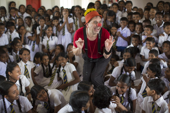 hello! … Hello! … HELLO! … echote es heute von über 1.200 Kindern und Ewachsenen den Clowns entgegen. Wir hatten erneut in zwei Schulen, diesmal einer singhalesischen und einer muslimischen, schöne Auftritte: In der ersten Schule warteten 580 Kinder in einem Raum, in dem eine deutsche Schulklasse Platzangst bekommen hätte. Deshalb standen zusätzlich auch vor jedem Fenster die Kinder, um unseren Auftritt zu sehen. In der zweiten Schule stand das gesamte Gelände unter Wasser und wir wurden mit den Bussen direkt bis an die Bühne gefahren. Über 600 Kinder und Erwachsene ließen sich mitreißen.