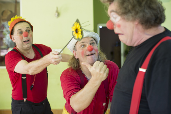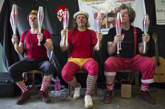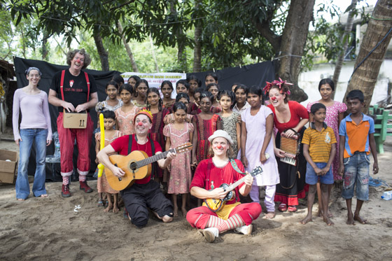 Noch immer überrascht uns jede unserer gespielten Shows durch ihre Andersartigkeit. Unseren Vormittag verbrachten wir in einer Schule, wo wir auf einer Feier zum hinduistischen Neujahr für 300 Personen auftraten. Nach der einen und anderen Rede waren die Kinder von Anfang an voll mit dabei. Als die Clowns eine Bühne voller Blüten betraten, genügte schon ein Lächeln von unserer Pipi und der Saal war gefüllt von winkenden Händen. Es bleibt faszinierend, welches Klangvolumen Kinder aufbauen können… Nachmittags waren wir zu Gast in einem Mädchenheim, wo wir mit viel Freude, Liebe und Dankbarkeit empfangen wurden. Die Jonglage unserer Männer erhielt besonders viel Applaus. Ganz fasziniert waren die kleinen Mädels zudem von Mattes Seifenblasen und die grösseren Mädels von Pepes Locken. Die logistischen Aufgaben haben sich mittlerweile um regelmässige Auskünfte zu Beziehungs- und Familienstand der Männer erweitert.