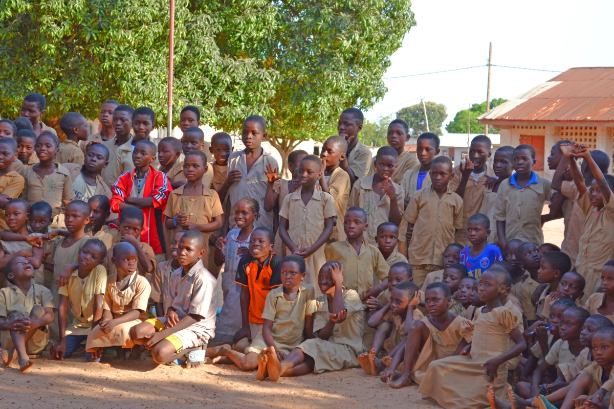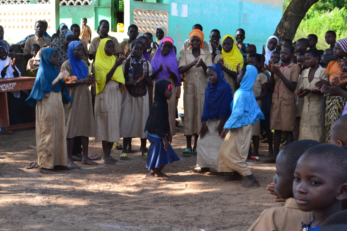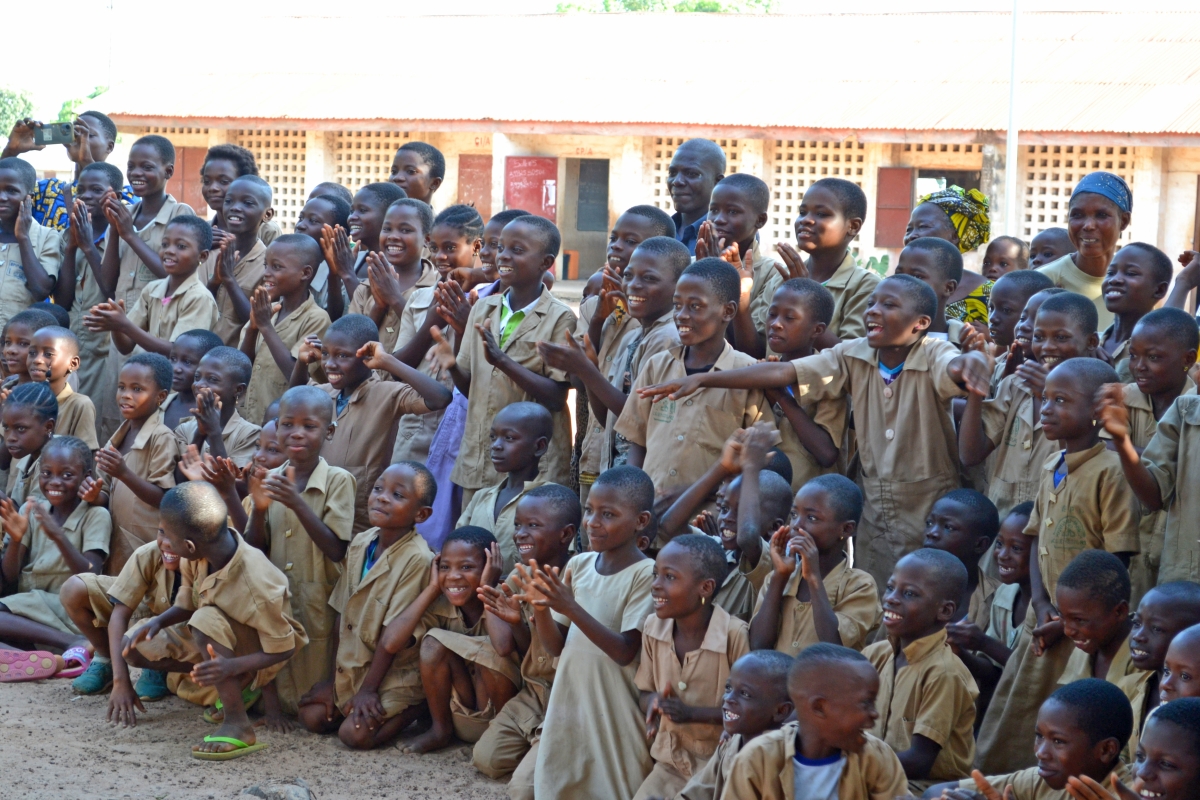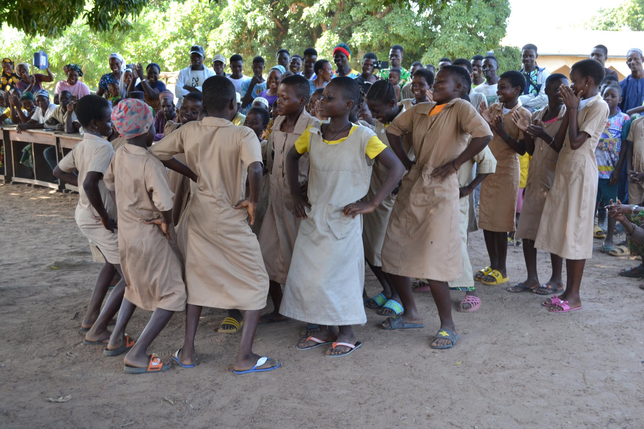 Nicht nur die Schule ist versammelt, das halbe Dorf ist gekommen. Selbst der König hat sich angekündigt. In dieser Schule berichtet man uns von einem besonderen erwähnenswerten Ziel. Hier wird sich gezielt dafür eingesetzt, dass besonders die Mädchen ihre Schulbildung fortsetzen. Der Schulabbruch vieler Mädchen ist in Benin ein großes Thema. Viele verlassen die Schule bereits zwischen der 5. und 9. Klasse. Häufig liegt das daran, dass Familien ihre Töchter in andere Regionen, meistens nach Nigeria, schicken (bis 50.000 Kinder im Jahr), um dort als Haushaltshilfen zu arbeiten, oder sie müssen schlichtweg auf dem eigenen Feld helfen.