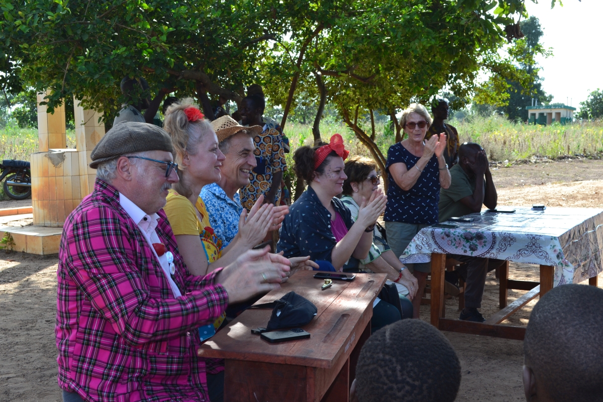 Draußen unter dem Baum haben sich alle irgendwann einmal während der Vorstellung den Kopf an einem tiefhängenden Ast angestoßen, wie wir lachend nach der Vorstellung feststellen müssen. Auch hier nehmen wir wieder Eindrücke und Wünsche der Ansässigen im Gepäck mit. Kaum zu glauben, aber wahr, der Kindergarten hat auch nach mehreren Jahren keine Toiletten, und der anwesende Bürgermeister beteuert, er würde ja gerne Abhilfe schaffen, damit die knapp 100 Kinder nicht mehr in das angrenzende Wäldchen gehen müssen – ihm sind aber die Hände gebunden. Dies deshalb, da zu Beginn des nächsten Jahres Wahlen in Benin stattfinden werden, in deren Folge ein neues Gesetz für Kindergärten in Kraft treten wird. Erst wenn das der Fall ist, wird die Genehmigung erfolgen, wenigstens eine Latrine zu bauen.