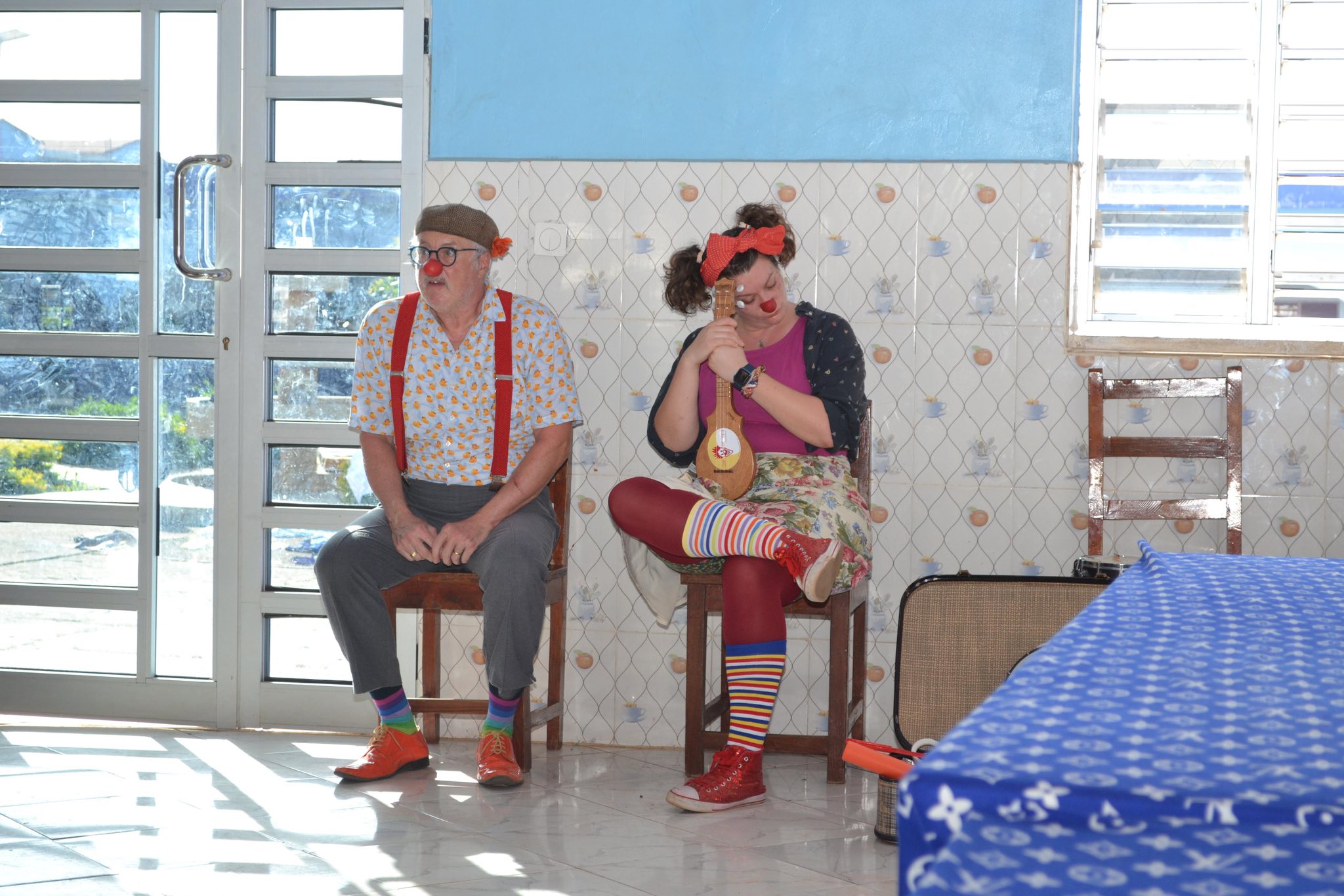 Wir spielen hier kurze Sequenzen in drei Zimmern der Pädiatrie und zum Abschluss eine längere Sequenz im Innenhof. Dieser Besuch berührt uns alle sehr und besonders schön zu sehen, wie sich mit unserem Spiel, in den Gesichtern der Eltern, denen man die Sorge um ihre Kinder eben noch angesehen hat, ein Lächeln breit macht.