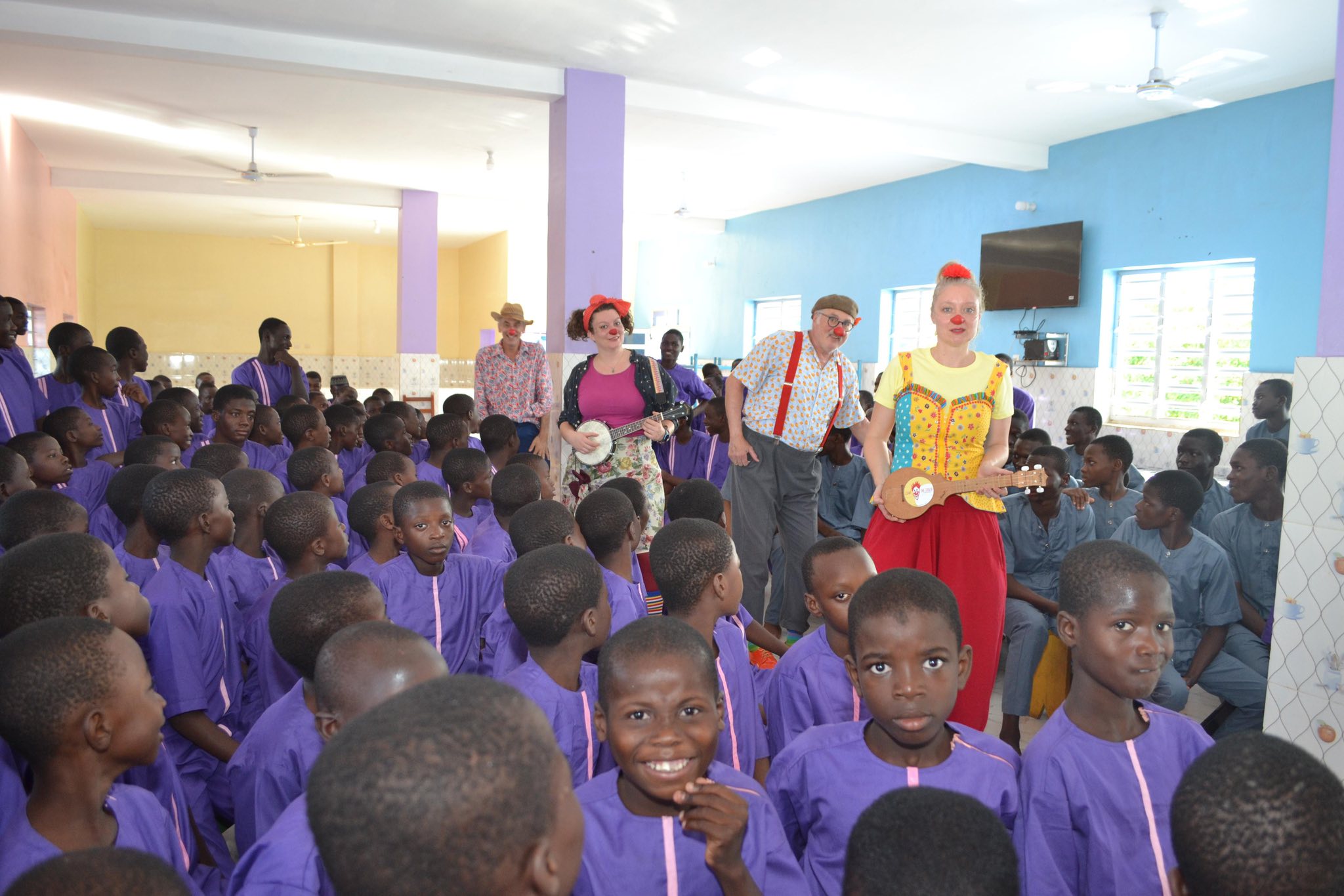 Am Sonntag wird der Auftritt in einem muslimisch geprägten Waisenhaus nachgeholt. Hier leben ausschließlich Jungen, während Mädchen und Jungen gemeinsam zur angeschlossenen Schule gehen. Alle fühlen sich wieder fit und so treten wir in gewohnter Besetzung auf. Gespielt wird in einer Art Aula mit erstaunlicher Akustik. Bei dem zuvor gespielten Begrüßungslied durch die hier wohnenden Kinder und Jugendliche, merken wir gleich, wie lebendig der Raum reagiert. Alle wirken sehr ruhig, diszipliniert und aufmerksam. Doch als der erste Clown stolperte und die Musik einsetzte, bricht das Lachen und die Freude los. Es wird wohl eine der emotionalsten Vorstellungen dieser Reise. Wir werden mit Dankbarkeit überschüttet.