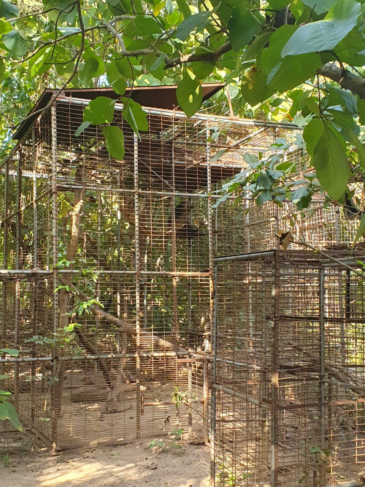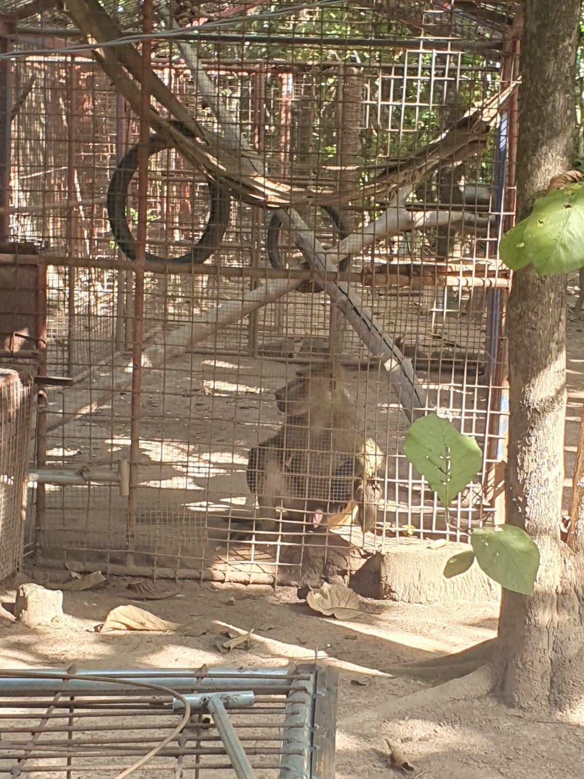 Die Nachmittagsvorstellung musste verschoben werden, daher steht etwas ganz anderes auf dem Programm; ein Besuch in einer Auffangstation für Affen. Die Gründerin, eine Französin, lebt seit vielen Jahren hier und kümmert sich ohne jegliche staatliche Unterstützung gemeinsam mit ihrem kleinen Team um verwaiste und verletzte Tiere. Ziel ist es nicht nur, die Affen in einem mehrstufigen Prozess aufzupäppeln und, wenn möglich, wieder auszuwildern, sondern sie generell vor dem Aussterben zu bewahren. Drei der vier hier lebenden Arten gibt es in Benin nur mehr hier. Doch viele können nie zurück in die Freiheit. Sie sind blind, verletzt oder verstümmelt. Es leben verschiedene Arten zusammen: Baobas, Atas und sogar eine Art Berberaffen. Einen Tierarzt gibt es nicht, vieles bringt sich das Team selbst bei.