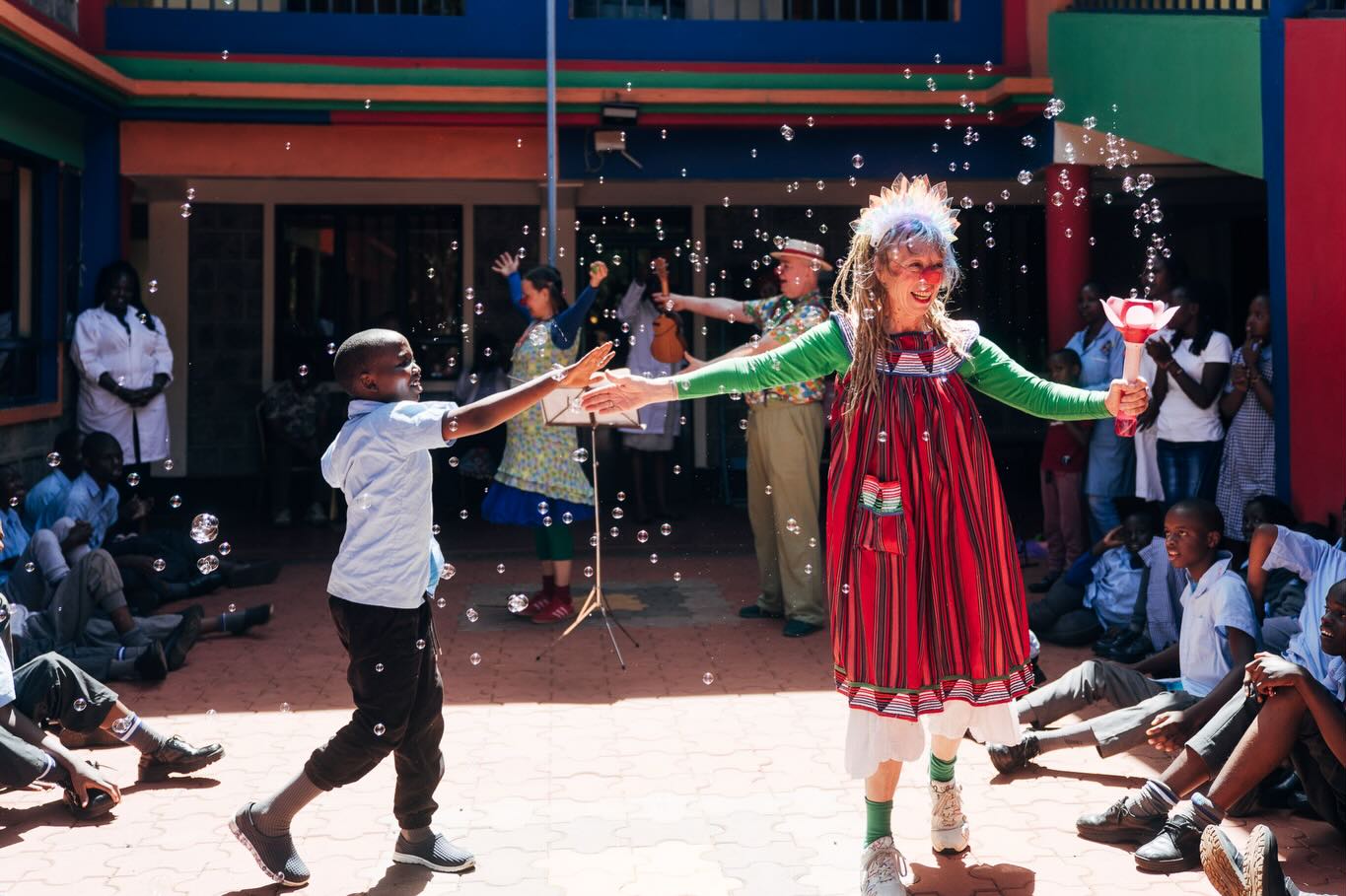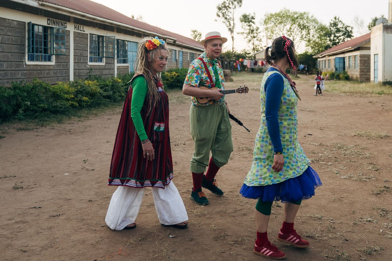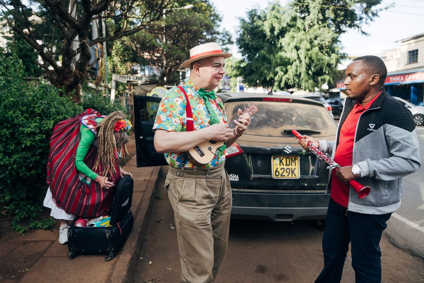 Auf Eddie zum Beispiel können wir uns verlassen. Sobald etwas schief geht, eilt der 12-Jährige zu Hilfe. Er baut behende den klapprigen Notenständer auf und hilft Heleneken, Pelle aus den Hosenträgern zu befreien. An die hundert Kinder tanzen nach der Show mit uns auf dem Schulhof, aus den Lautsprechern tönen kenianische Rhythmen. Es ist ein großes Wiedersehensfest. Und auch ein Abschied.