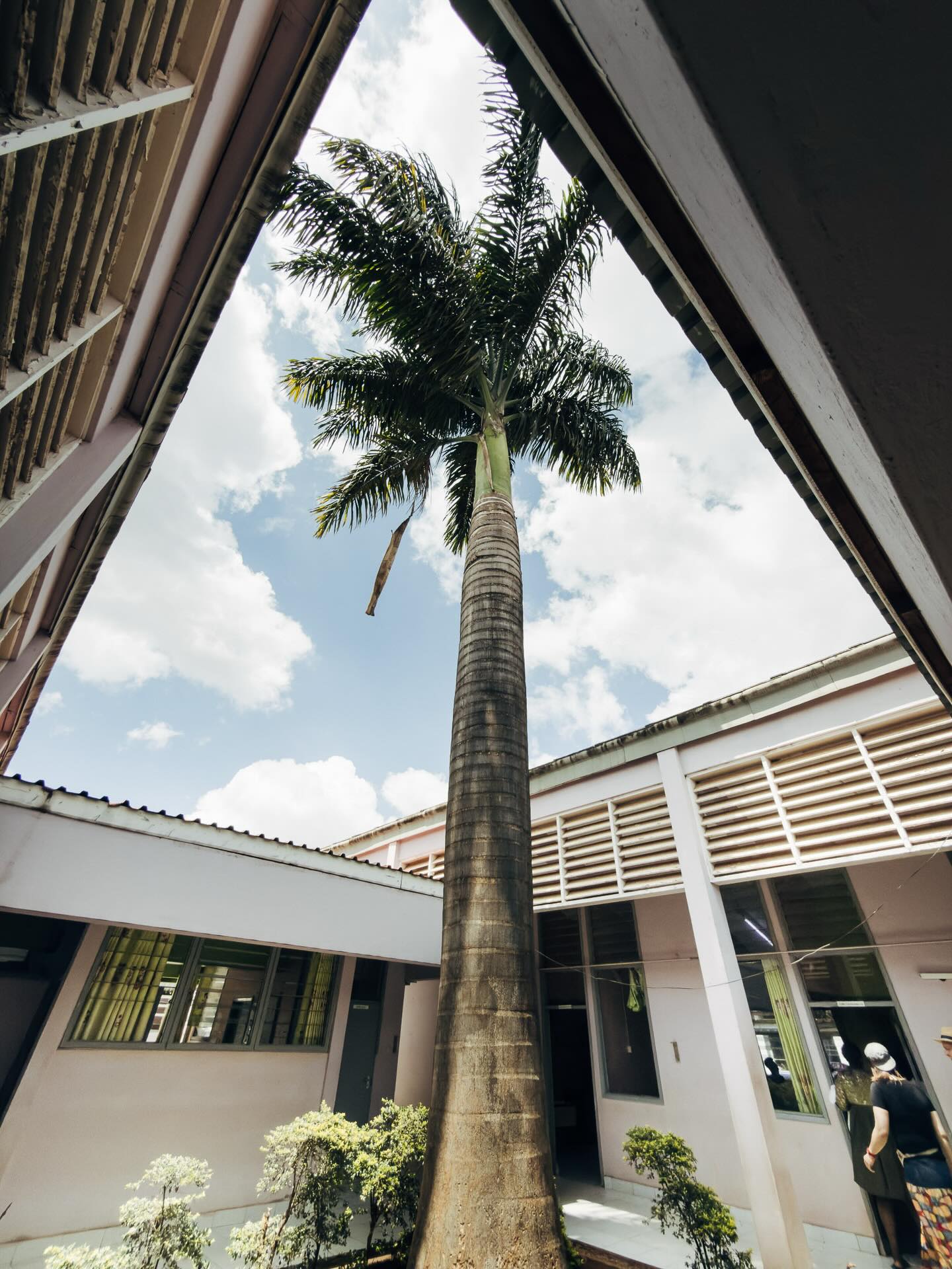 Aber zunächst mal geht’s weiter zum Krankenhaus. Die Kinderstation haben wir vor zwei Tagen bereits besucht. Heute spielen wir im palmenbestandenen Innenhof. Noch ist Besuchszeit. Wir ziehen mit Klarinette und Ukulele über den Flur. Schnell versammeln sich im Innenhof ungefähr 70 Patient*innen, Besucher*innen und Pflegekräfte. Zwei Mitarbeiterinnen klatschen und tanzen sofort mit. Auch die Kinder sind voll dabei.