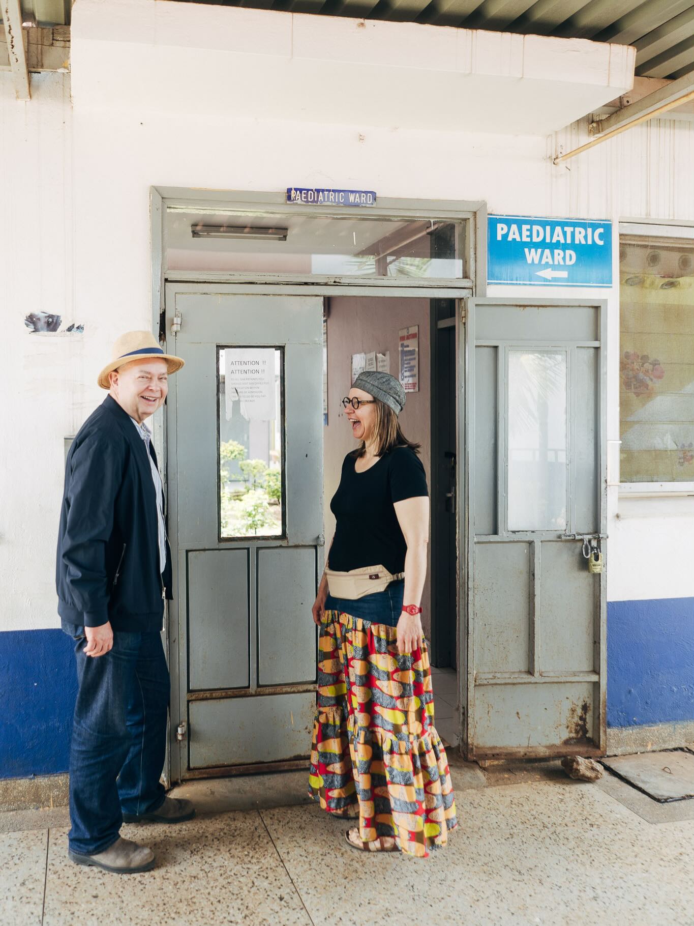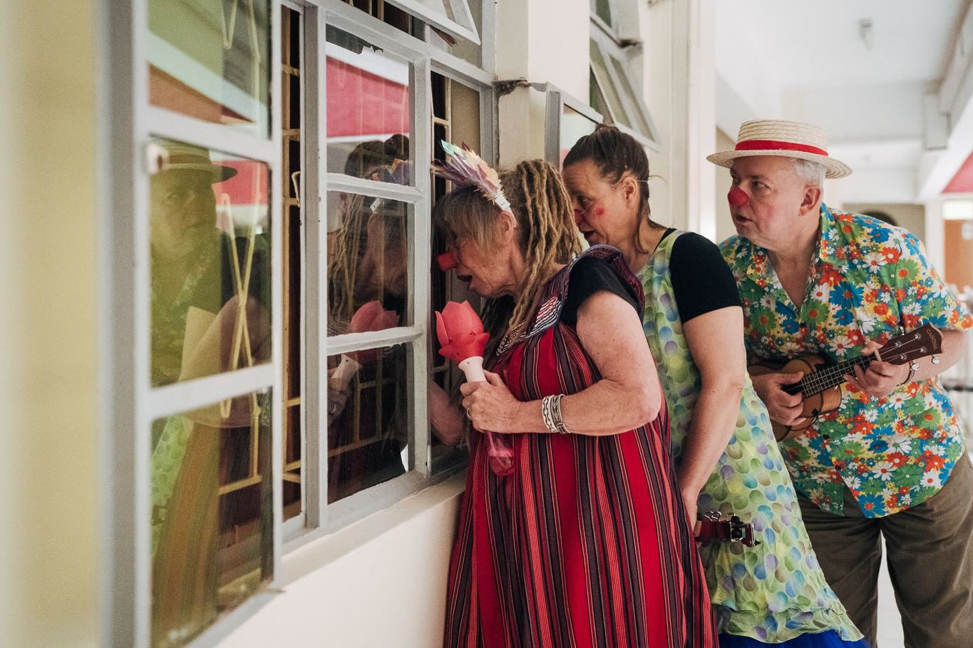 Weiter zum örtlichen Krankenhaus. Im Wartebereich dürfen wir unsere schwarze Clowns-ohne-Grenzen-Fahne aufhängen. Schnell kommen auch Patient*innen aus den Stationen dazu. Manche wundern sich, dass wir keine medizinischen Lektionen im Gepäck haben. Eine Mitarbeiterin fragt, welche Spende wir denn dabei hätten.