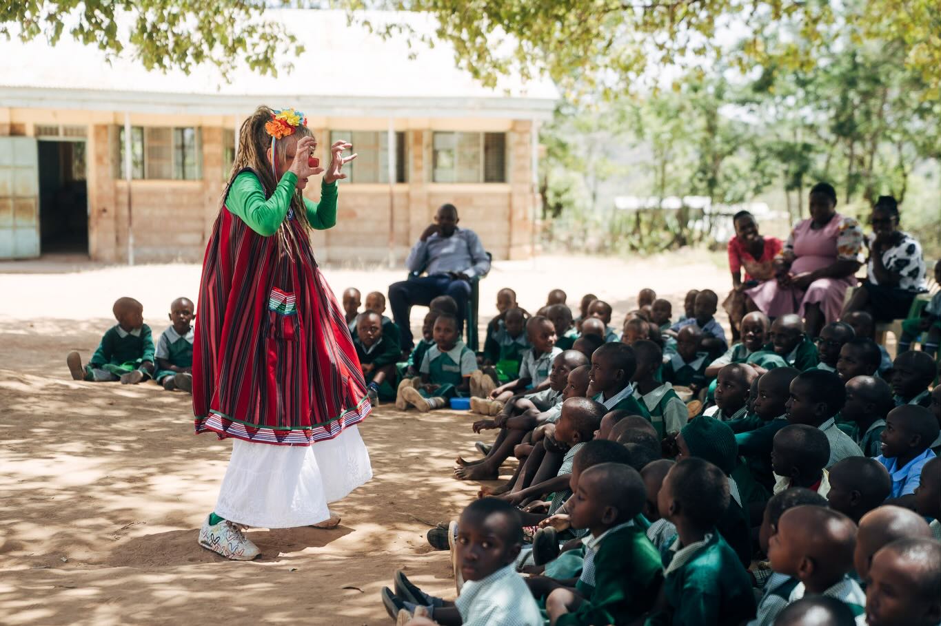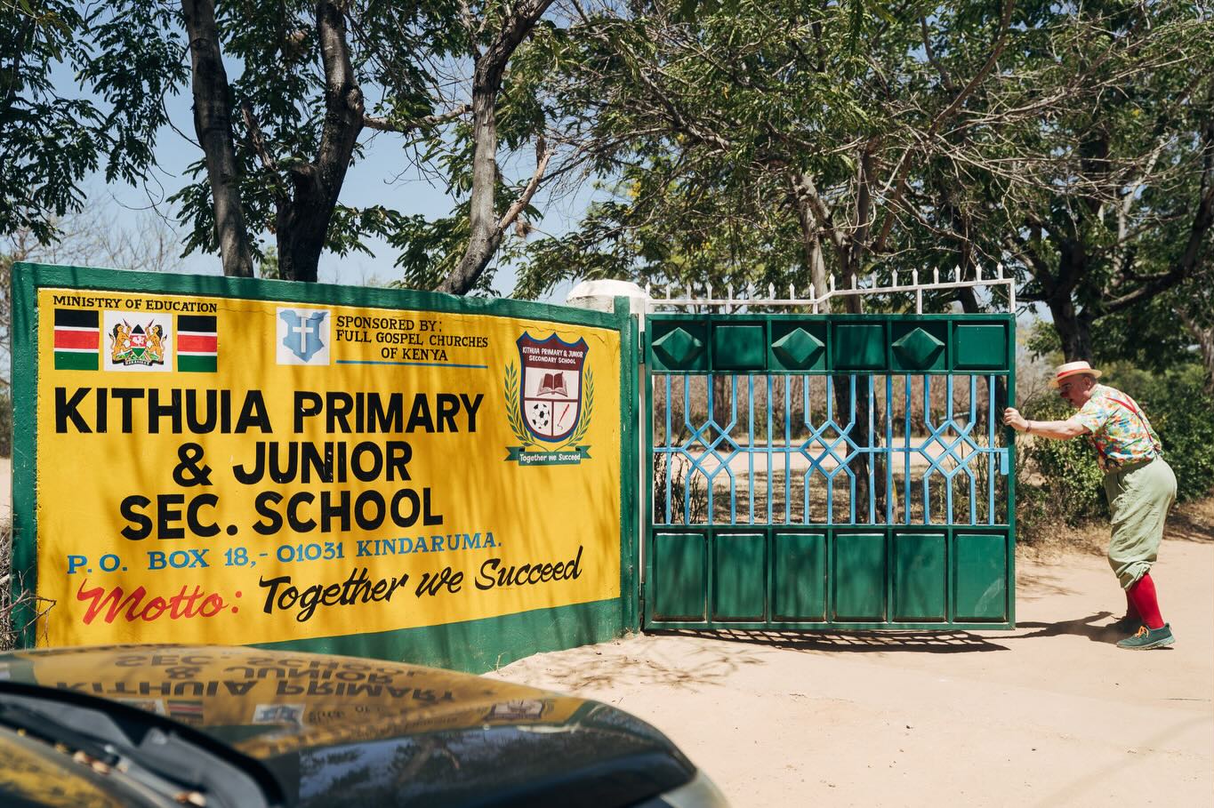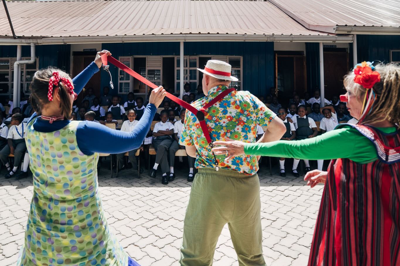 Wir sitzen noch beim ausgiebigen Mango-, Papaya- und Omelette-Frühstück, als das Telefon unseres Gastgebers klingelt. Die Kinder der Moi Primary School sitzen schon bereit in der Dining Hall, sagt Francis. Dahin brauchen wir fast eine Stunde! Schnell in die Kostüme, schminken, Requisiten ins Auto und los geht’s.