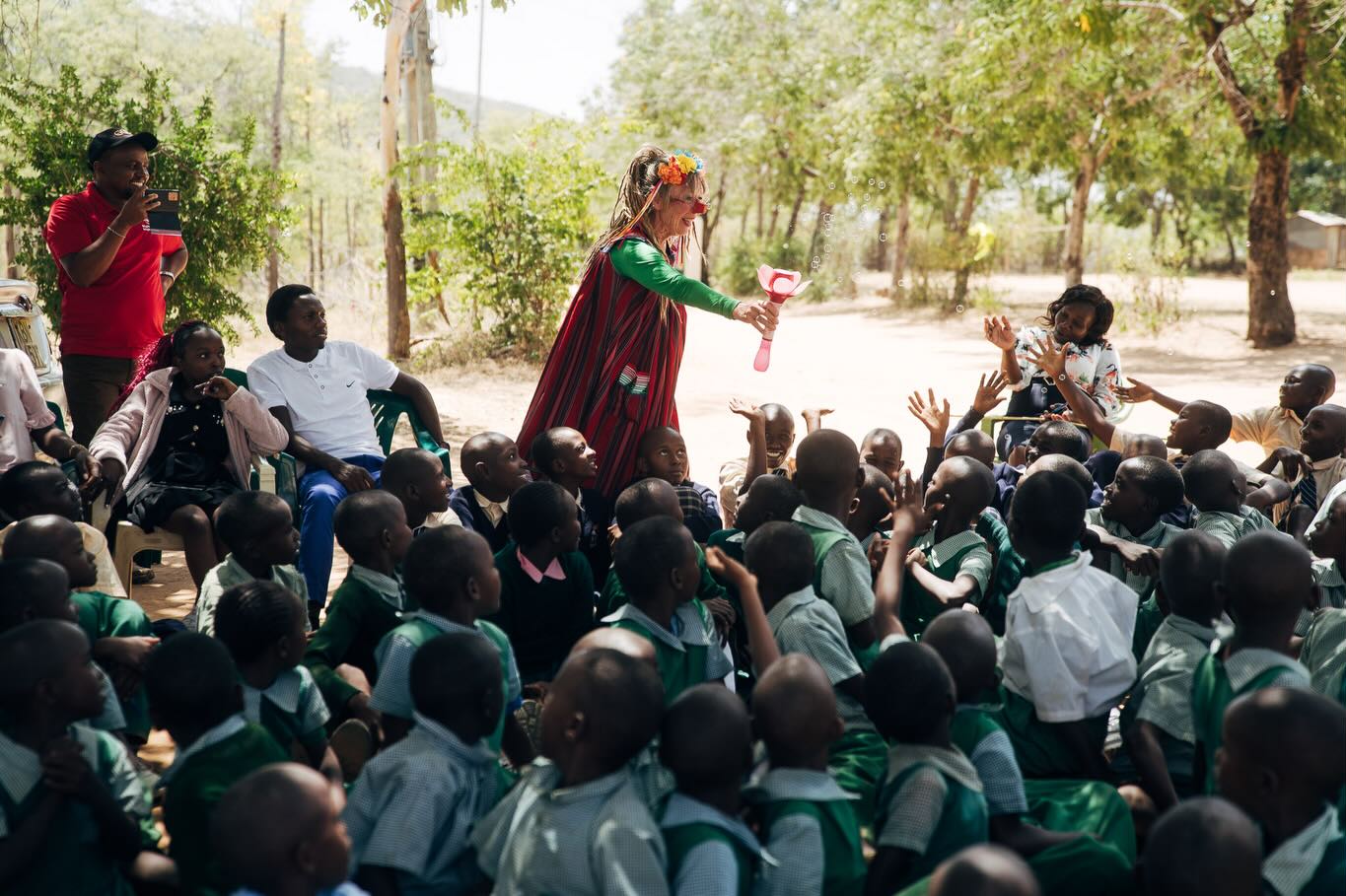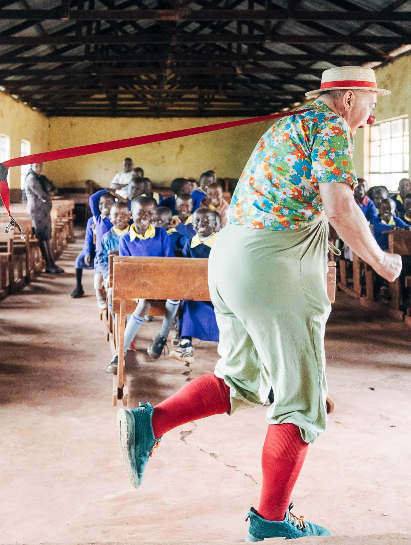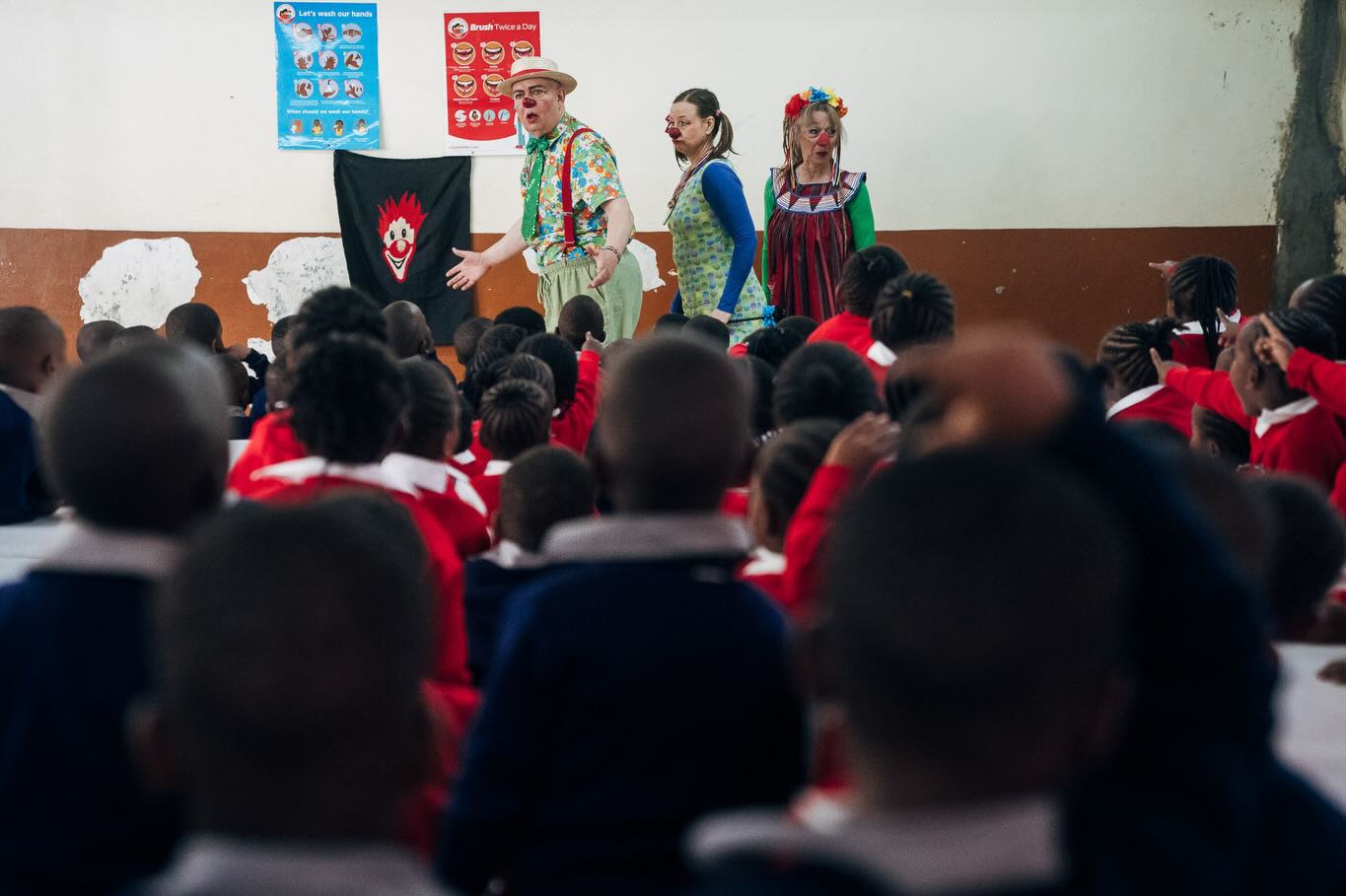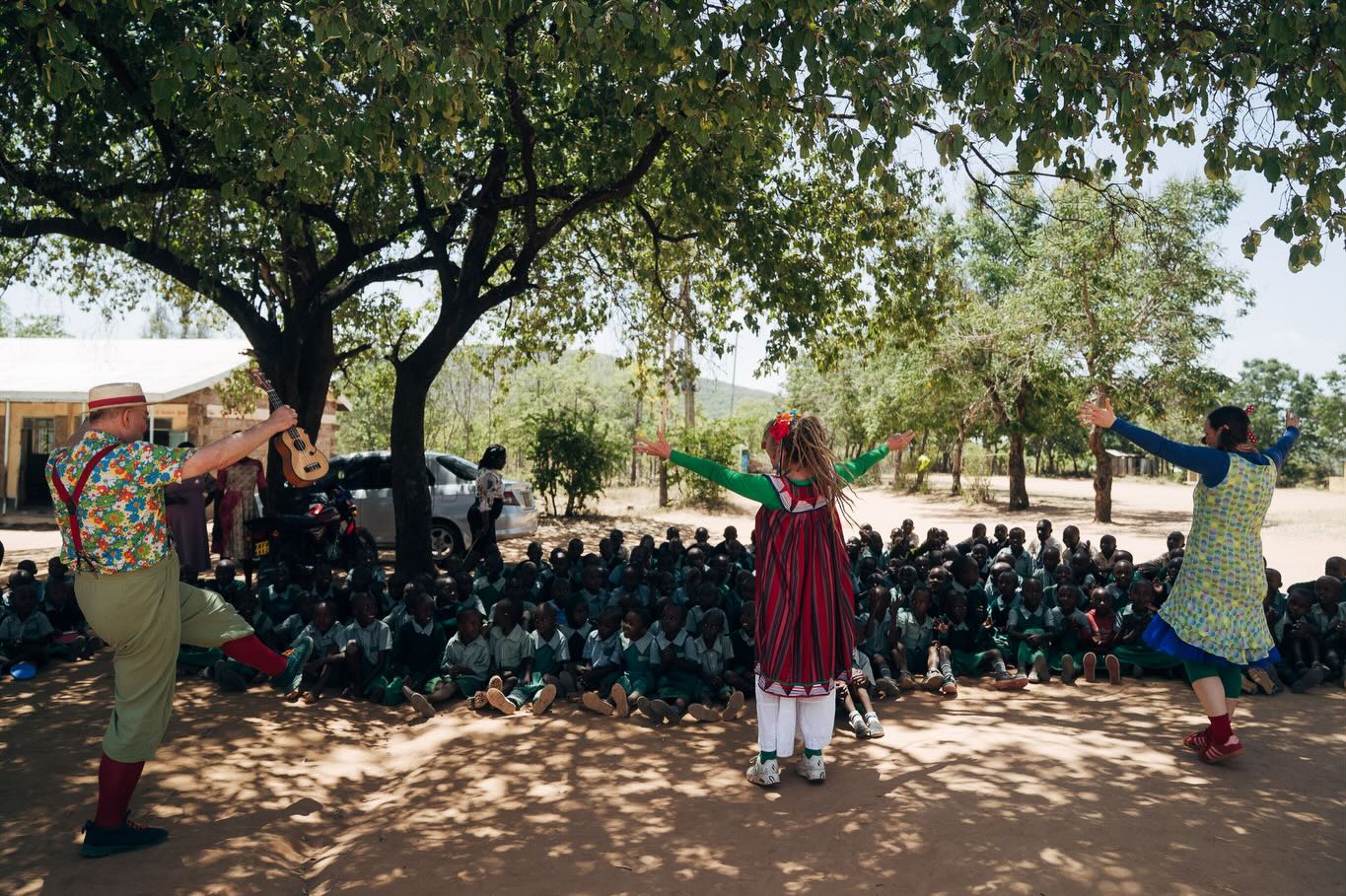 Aber wir müssen weiter. In der Mabanda Primary & Junior School spielen wir im Freien. Hunderte Kinder stehen auf dem staubigen Boden in der Sonne, manche klettern auf Bäume und Wasserkanister, um besser zu sehen. Auf der offenen Galerie quetschen sich die höheren Jahrgänge. Die Kinder vor der Bühne werden immer weiter nach vorne gedrängt – gerät hier gleich wieder alles außer Kontrolle? Eine Lehrerin schwingt einen Stock, um für Disziplin zu sorgen. Alle weichen einen Schritt zurück. Die Show ist gerettet. Zum Abschluss dürfen wir auch hier der Direktorin die rote Clownsnase aufsetzen.