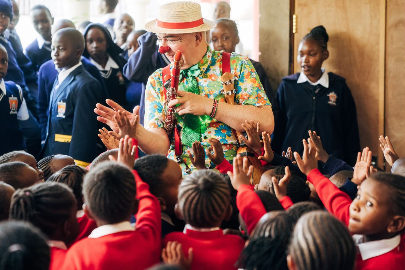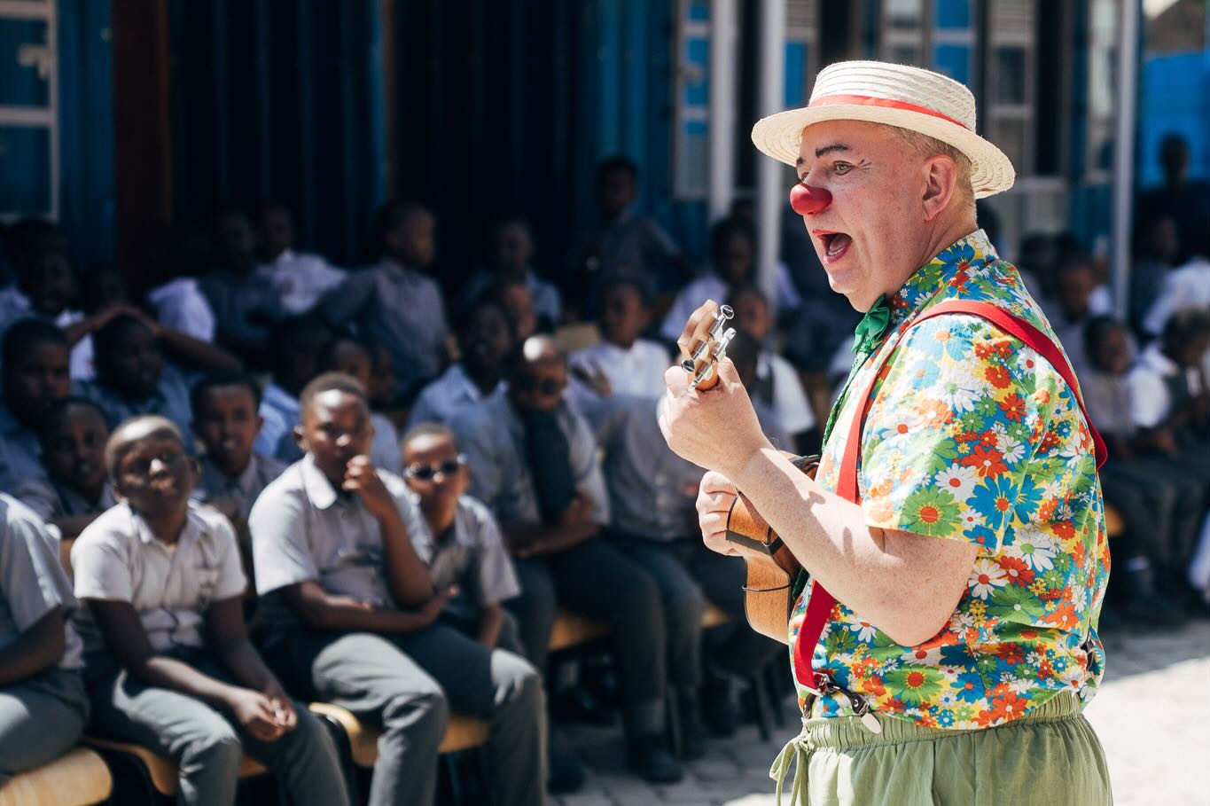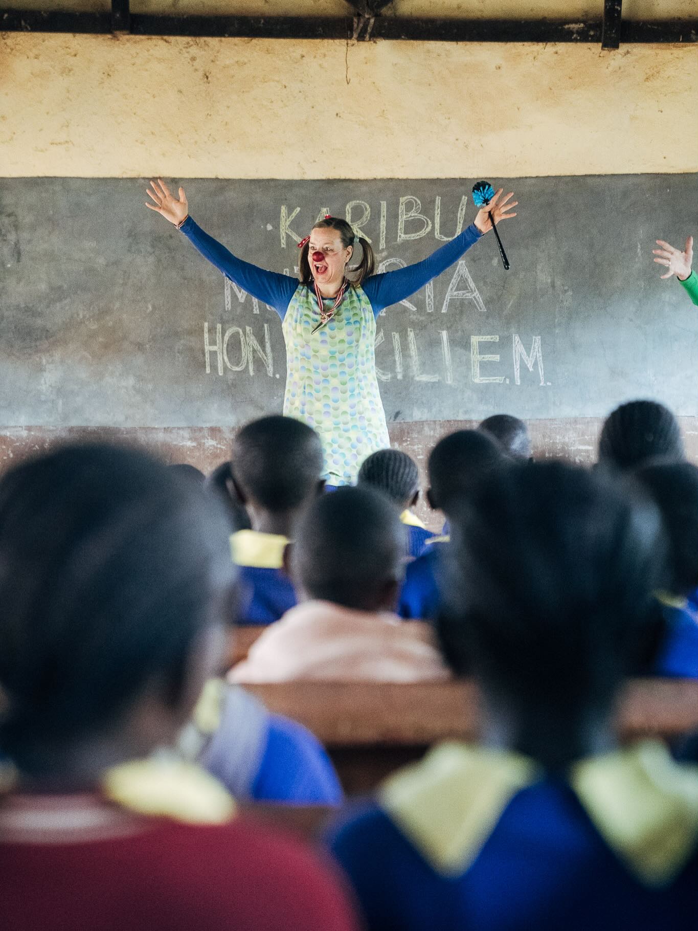 Aber wir müssen weiter. In der Mabanda Primary & Junior School spielen wir im Freien. Hunderte Kinder stehen auf dem staubigen Boden in der Sonne, manche klettern auf Bäume und Wasserkanister, um besser zu sehen. Auf der offenen Galerie quetschen sich die höheren Jahrgänge. Die Kinder vor der Bühne werden immer weiter nach vorne gedrängt – gerät hier gleich wieder alles außer Kontrolle? Eine Lehrerin schwingt einen Stock, um für Disziplin zu sorgen. Alle weichen einen Schritt zurück. Die Show ist gerettet. Zum Abschluss dürfen wir auch hier der Direktorin die rote Clownsnase aufsetzen.