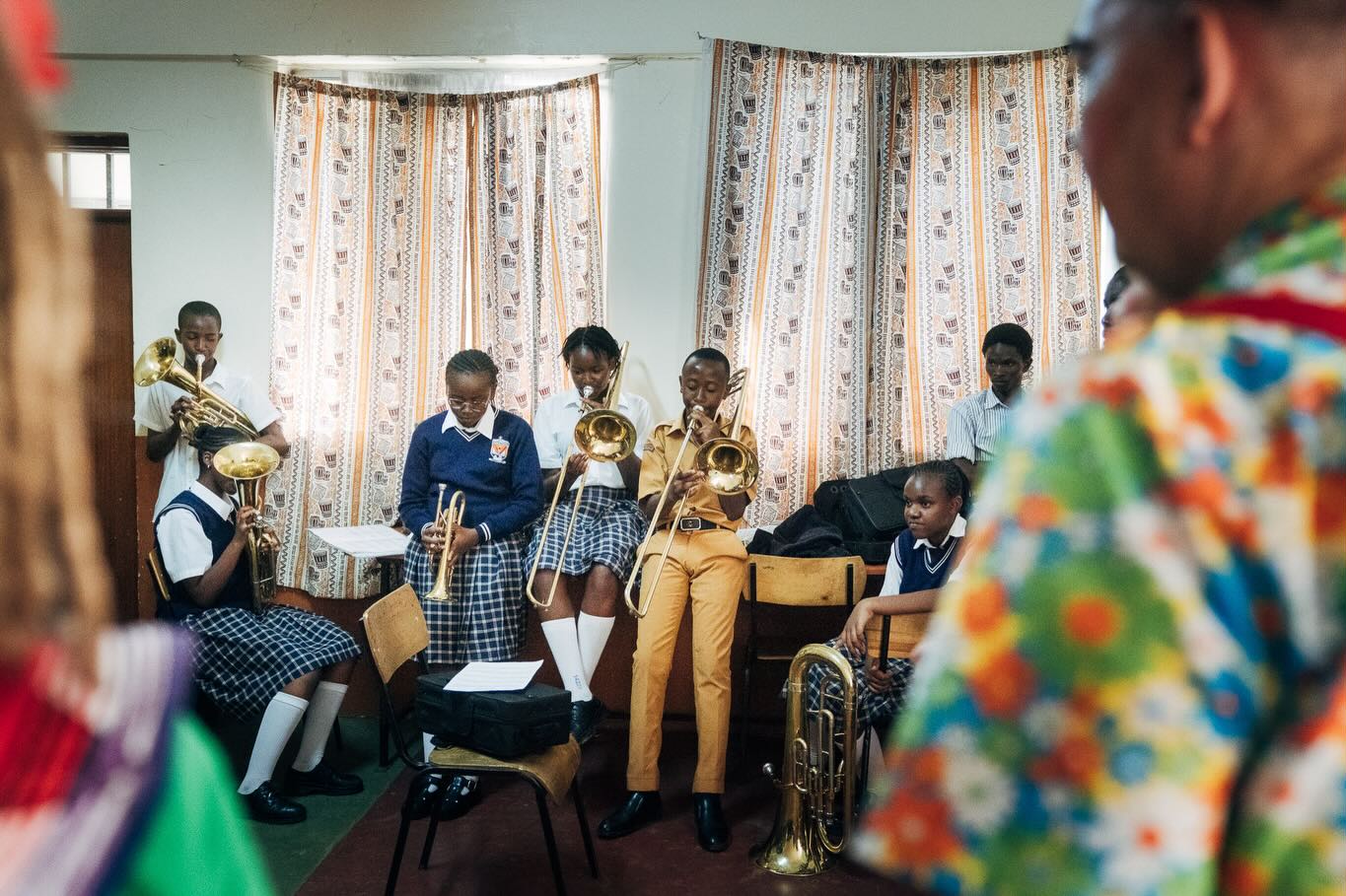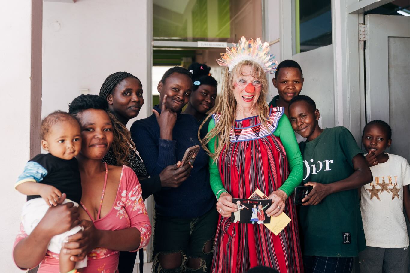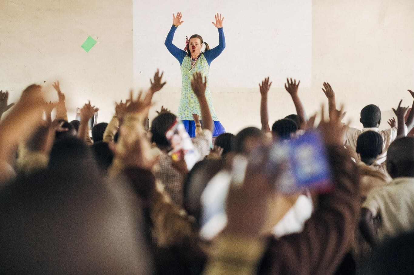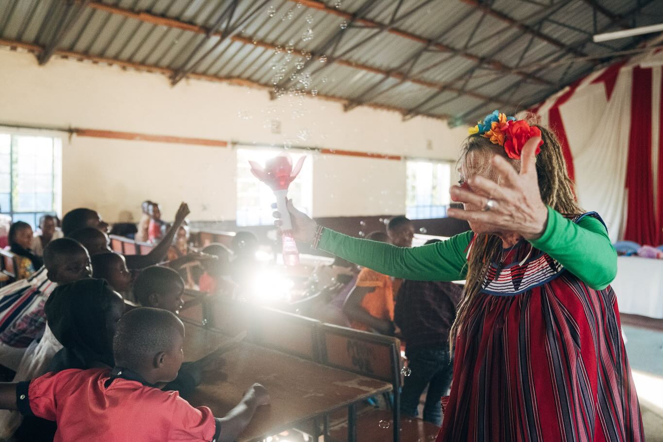 Aber wir müssen weiter. In der Mabanda Primary & Junior School spielen wir im Freien. Hunderte Kinder stehen auf dem staubigen Boden in der Sonne, manche klettern auf Bäume und Wasserkanister, um besser zu sehen. Auf der offenen Galerie quetschen sich die höheren Jahrgänge. Die Kinder vor der Bühne werden immer weiter nach vorne gedrängt – gerät hier gleich wieder alles außer Kontrolle? Eine Lehrerin schwingt einen Stock, um für Disziplin zu sorgen. Alle weichen einen Schritt zurück. Die Show ist gerettet. Zum Abschluss dürfen wir auch hier der Direktorin die rote Clownsnase aufsetzen.