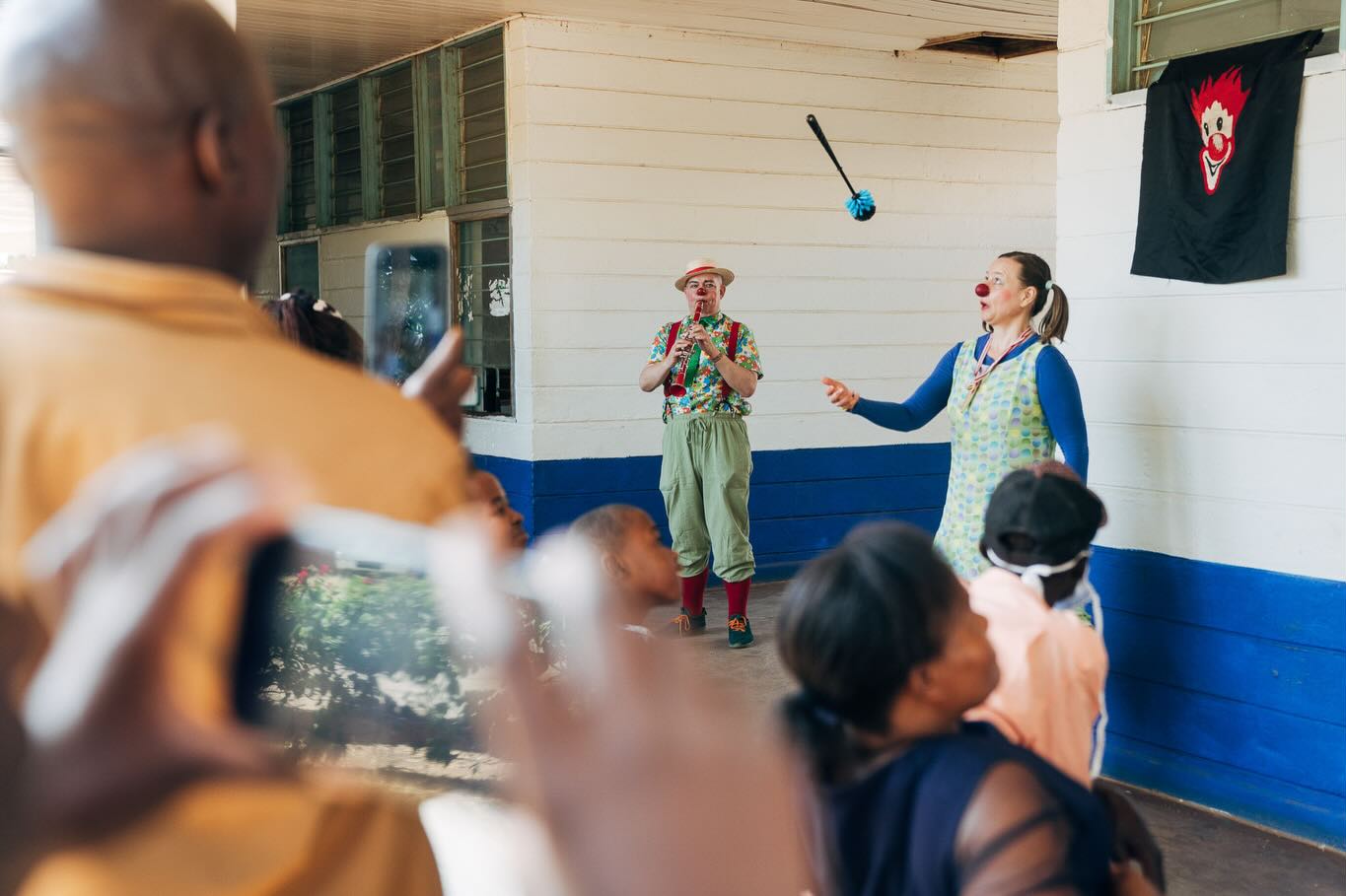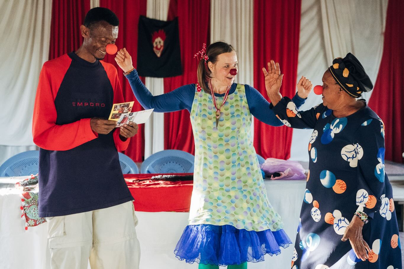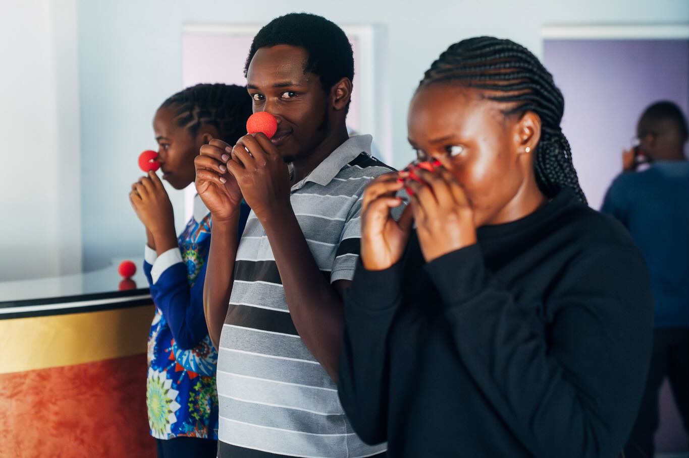 Junge Zahngesundheitshelfer*innen werden in die Dörfer geschickt, um den Kindern das Zähneputzen beizubringen. Wir geben ihnen eine Einführung ins Clowning. Wie fühlt es sich an mit einer roten Nase im Gesicht? Wie nehme ich meinen Körper im Raum wahr? Und mein Publikum? Wir nehmen viel Offenheit für unsere Methoden wahr. Und das, obwohl – oder gerade weil – Clowns für die meisten hier ein Fremdwort sind.