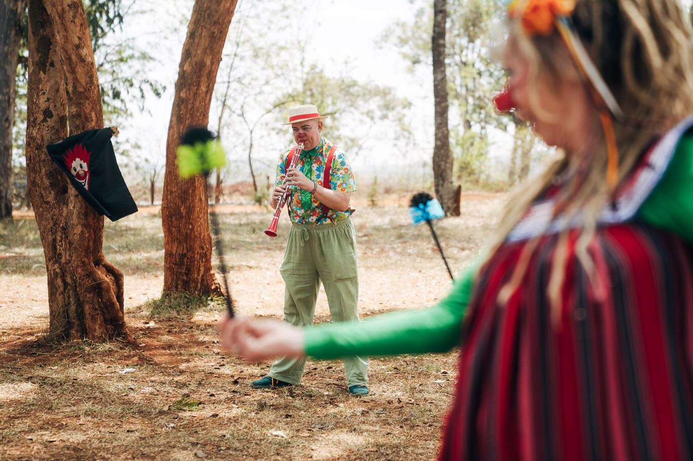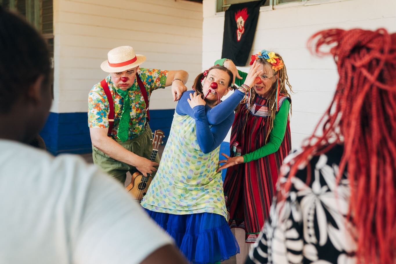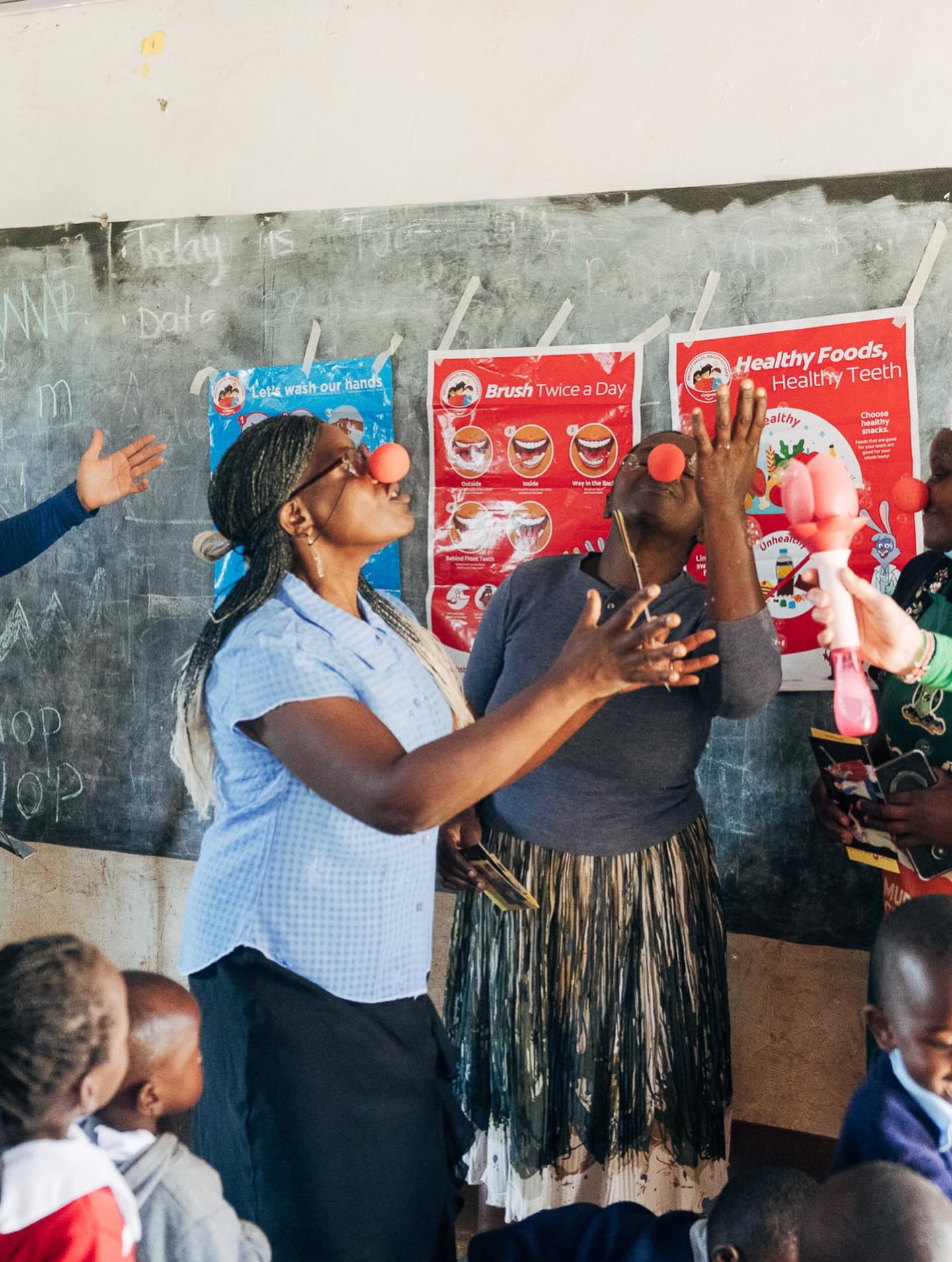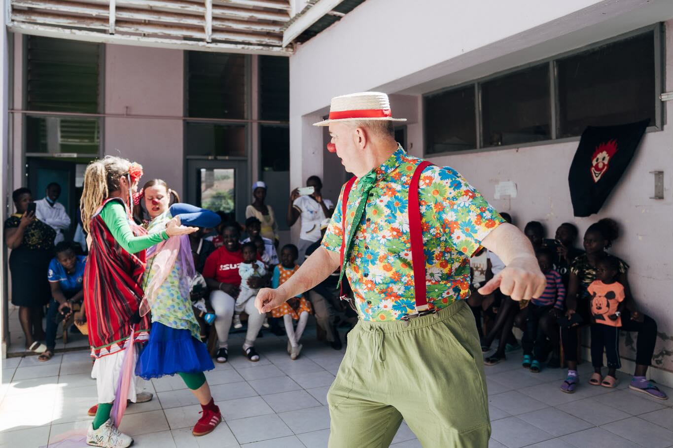 Junge Zahngesundheitshelfer*innen werden in die Dörfer geschickt, um den Kindern das Zähneputzen beizubringen. Wir geben ihnen eine Einführung ins Clowning. Wie fühlt es sich an mit einer roten Nase im Gesicht? Wie nehme ich meinen Körper im Raum wahr? Und mein Publikum? Wir nehmen viel Offenheit für unsere Methoden wahr. Und das, obwohl – oder gerade weil – Clowns für die meisten hier ein Fremdwort sind.