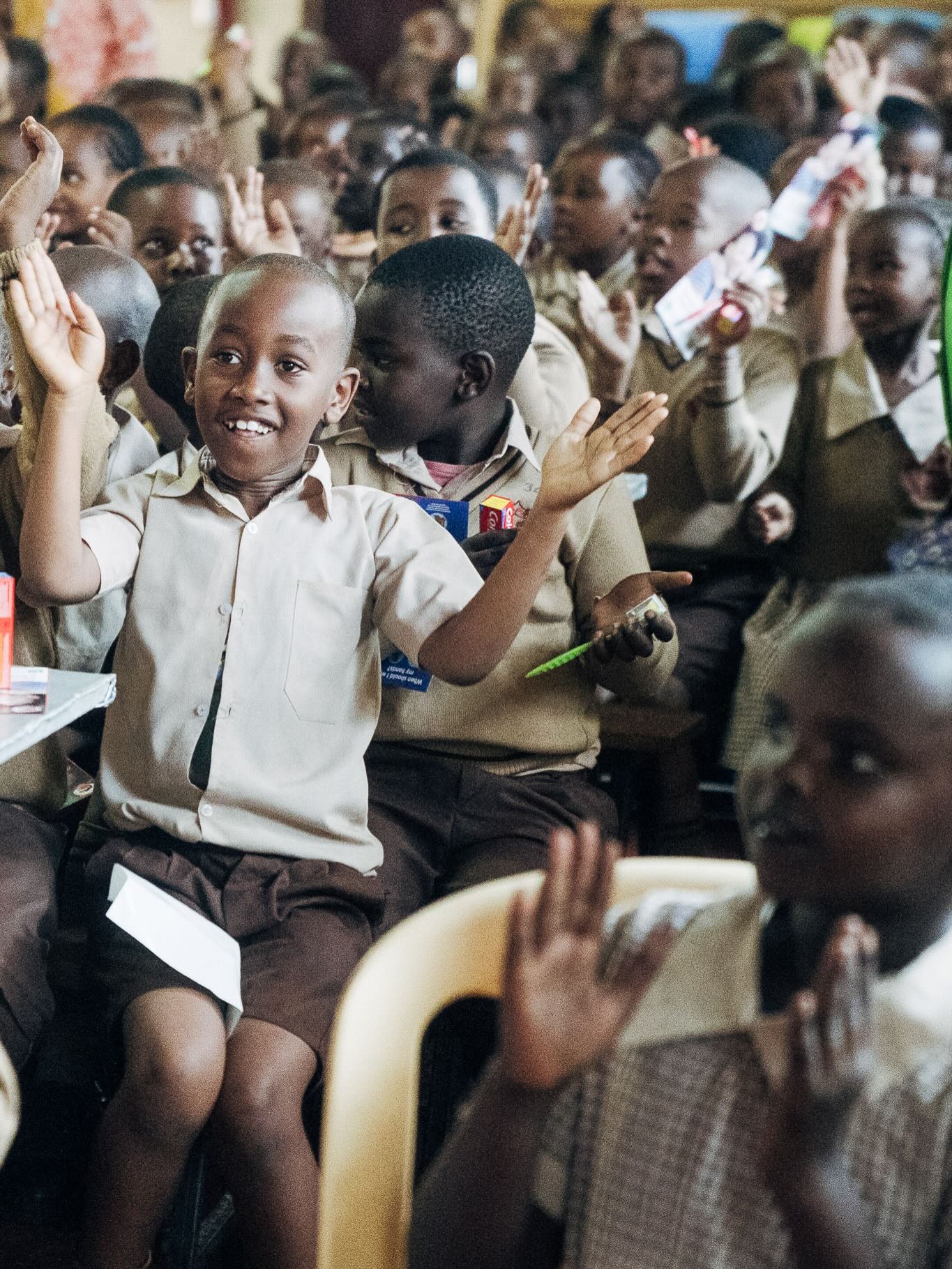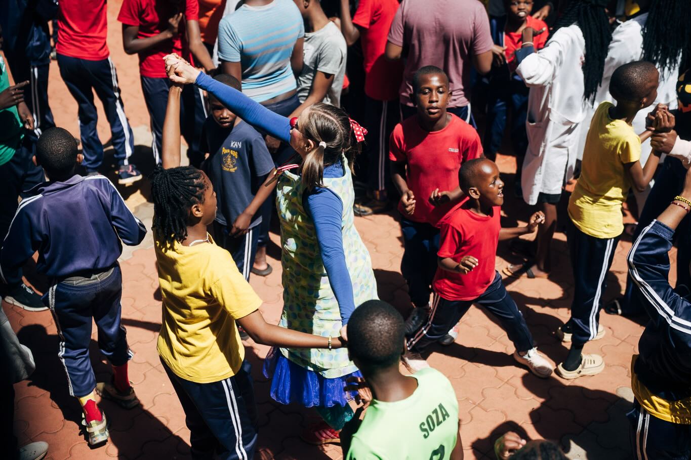 Und schließlich weiter zur Makongo-Grundschule. Auf einer Lichtung hinter dem Schulgebäude warten schon etwa 270 Kinder mit ihren Lehrerinnen. Sie rücken uns immer näher, gehen mit, wollen Ukulele und Kamera anfassen – und natürlich die Seifenblasenmaschine. Wieder verteilen wir Dutzende Faustgrüße, schütteln Kinderhände und überreichen unsere roten Nasen an die Lehrerinnen.