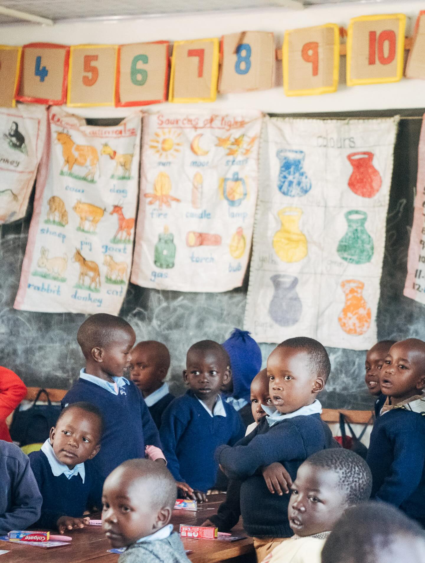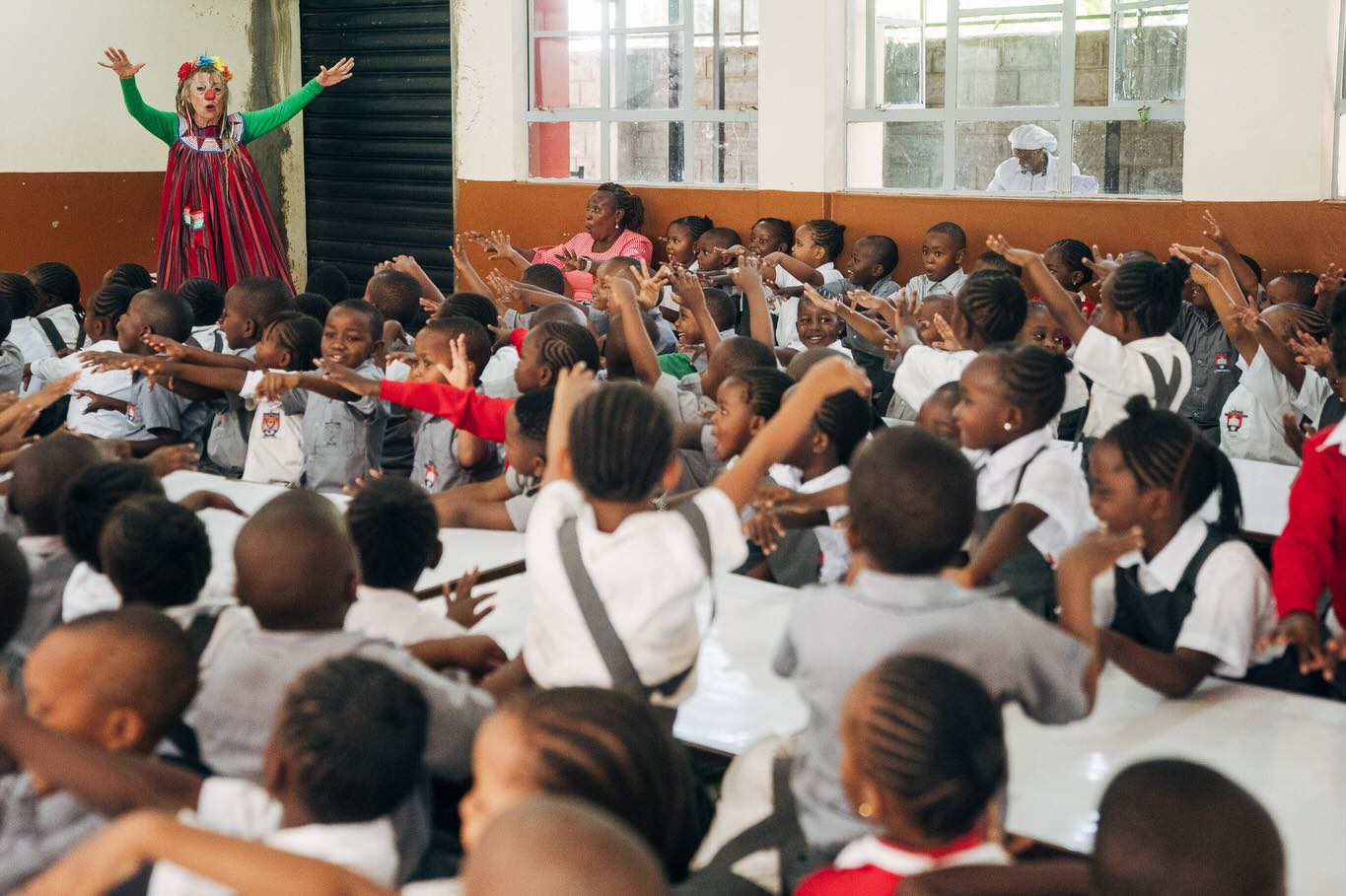 In der nächsten Schule, die wir ansteuern, sind die Kinder kleiner, und der Raum platzt aus allen Nähten. In der Vorschulklasse quetschen sich 100 Kinder auf kleine bunte Plastikstühle. Die Wände sind vollgehängt mit Erklärtexten, Illustrationen, Zahlen und Buchstaben. Die Lehrerinnen freuen sich riesig über die roten Nasen, die wir ihnen aufstecken, und tanzen zusammen mit den Kindern für uns. Nach der Show umringen die Kinder unser Auto und wir dürfen wieder viele Hände schütteln.