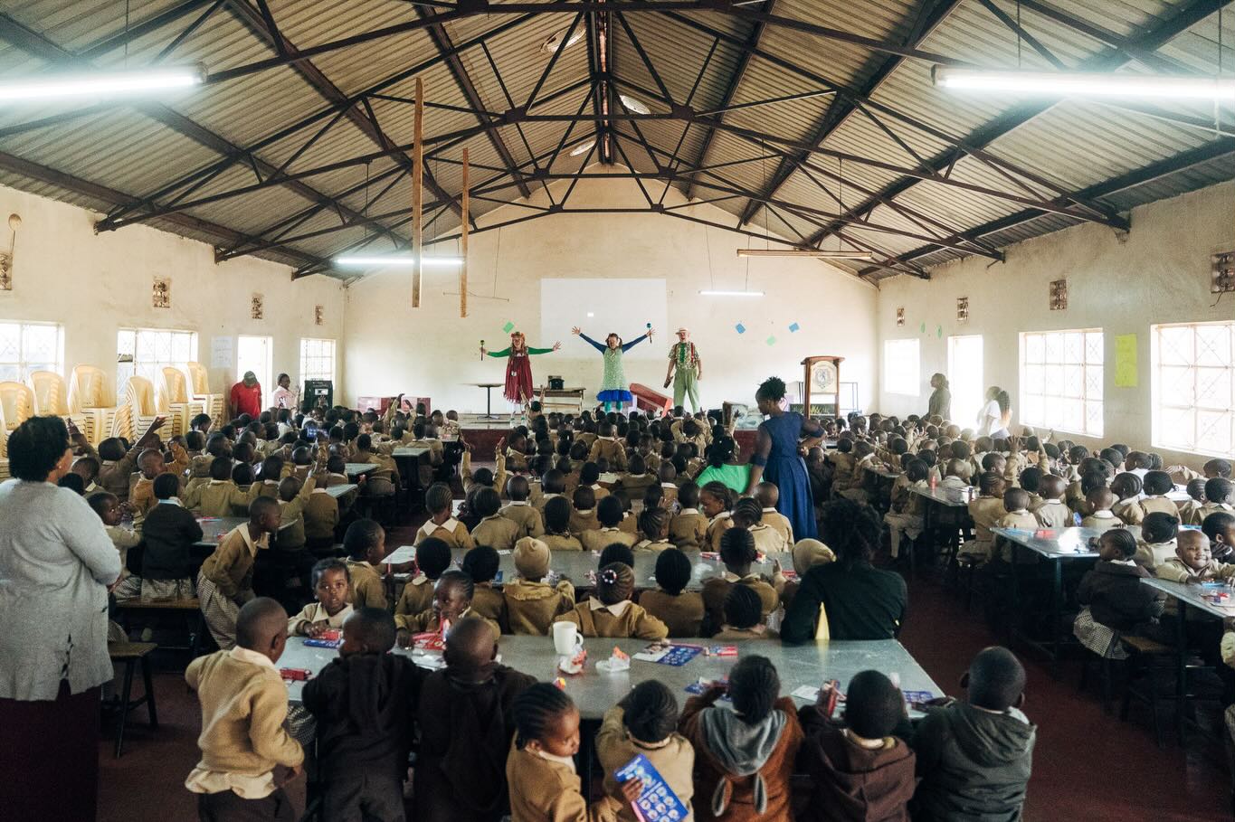 Im zur Aula umfunktionierten Speisesaal warten bereits 50 Kinder auf unsere Show. Die jüngsten sind im Vorschul-Alter, der Älteste 22. Schon als Pelle mit seiner Ukulele einzieht, können sie sich vor Lachen kaum auf den Sitzen halten.