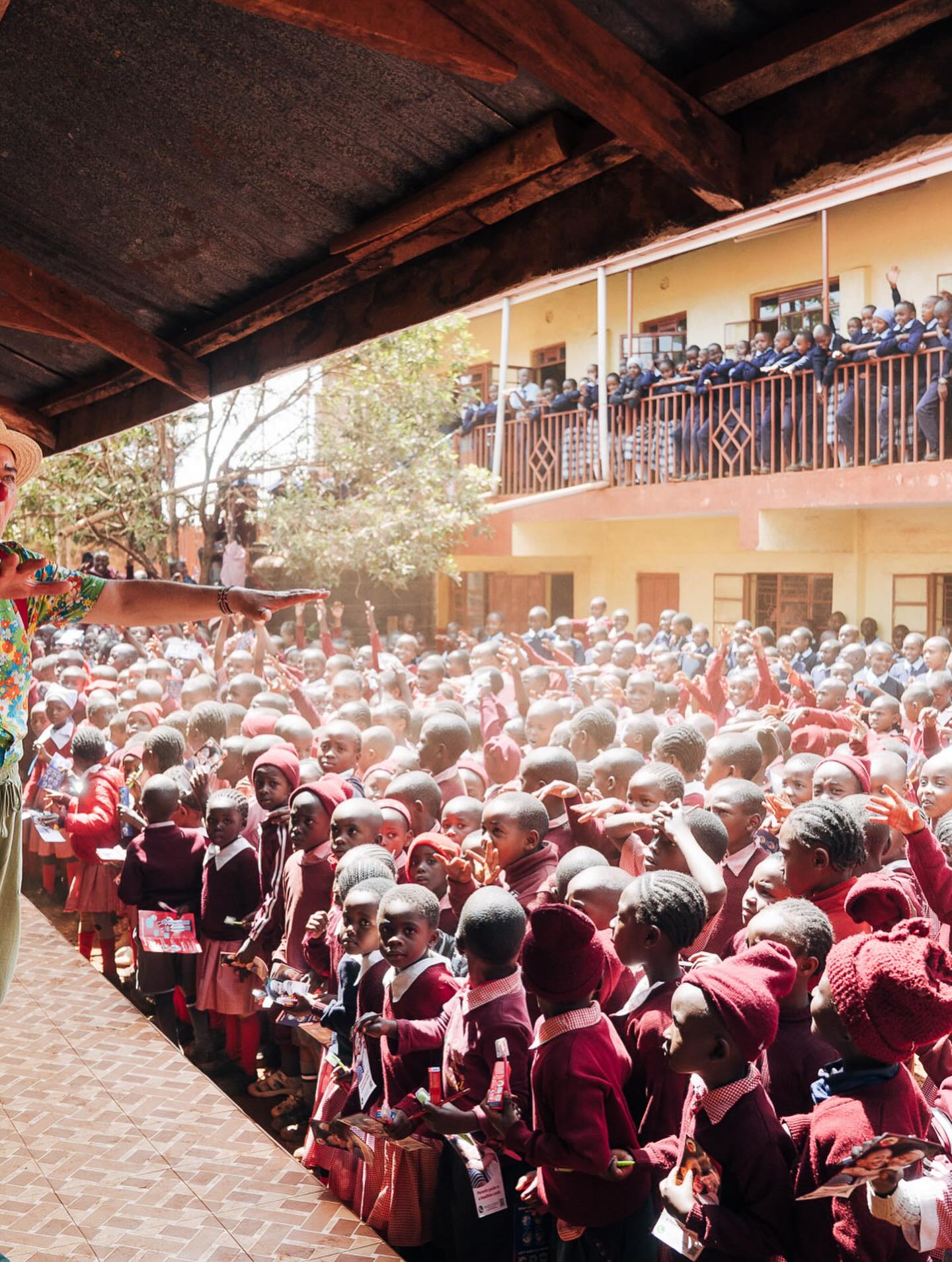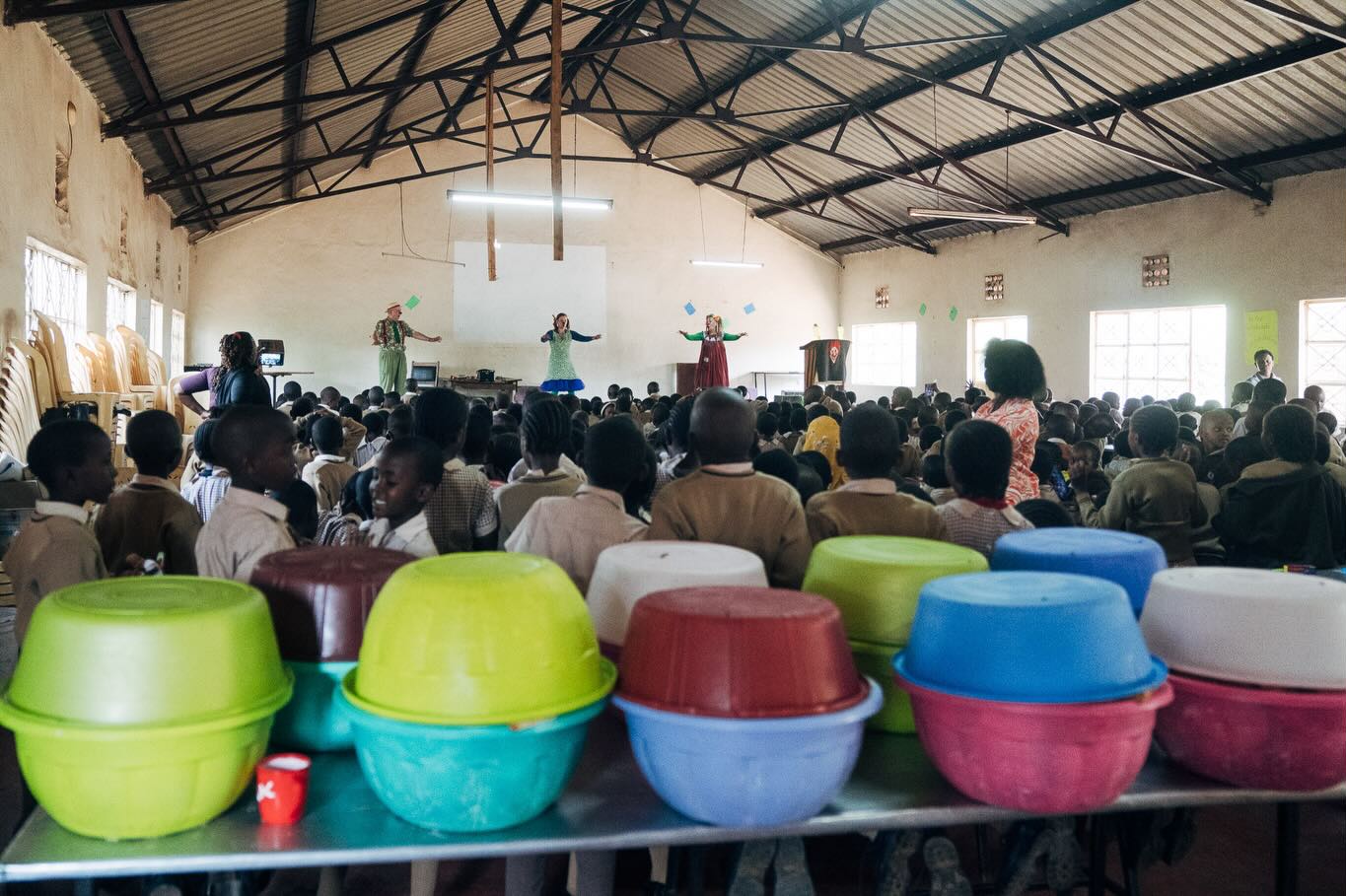 Heute sind wir im Muranga County unterwegs, das für den Anbau von Bananen und Avocados bekannt ist. In dem riesigen Speisesaal ist kein einziger Platz mehr frei. Die Vorschule zählt 370 Kinder. Sie begrüßen uns mit einem ohrenbetäubenden Applaus. Die Seifenblasen setzen wir heute nur sehr sparsam ein, trotzdem stürmen die Kinder zum Finale auf die Bühne.