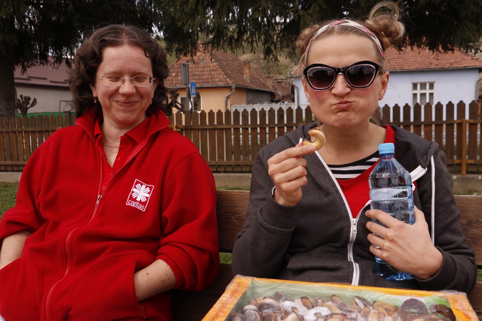 | Besonders toll ist der Austausch (hier mit Bernadett von der Caritas) mit einer Kiste voll leckersten rumänischen Keksspezialitäten! Gastfreundlichkeit PUR in Rumänien! |