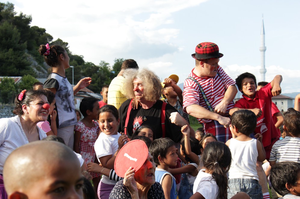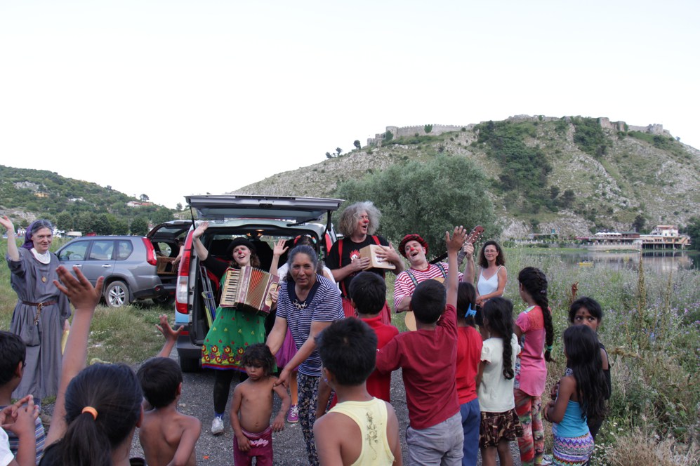 Um 17.00 Uhr waren wir wie abgesprochen an der Brücke neben der Tankstelle und haben auf Schwester Christina gewartet, damit sie uns zum Roma-Lager führt. Als wir im Lager ankamen wurden wir schon erwartet. Auf dem Fußballplatz tummelten schon viele Kinder und Erwachsene. Auf dem Weg dorthin begleiteten uns viele Kinder, die fasziniert unsere Instrumente anfassten. Immer wieder nahmen sie meine Ukulele und spielten damit und forderten mich auch immer wieder aufzuspielen. Endlich auf dem Platz angekommen wurden erstmal alle organisiert sich hinzusetzen. Es war alles sehr wuselig und laut, alle waren tierisch aufgeregt und ich wusste nicht wo mir der Kopf stand, weil so viel Energie von den Kindern sowie Erwachsenen ausging. Die Show für die Romas zu spielen war grandios. Drei sehr alte zahnlose Frauen saßen in der ersten Reihe und hatten einen heiden Spaß, eine von ihnen war blind und 100 Jahre alt. Die Kinder sind mit unserer Geschichte mitgegangen und waren oft nicht zu halten. Nach unserer Show kamen sie sofort auf uns zu und wollten wiedermal die Instrumente spielen. Wir spielten und scherzten noch eine Zeit mit ihnen.