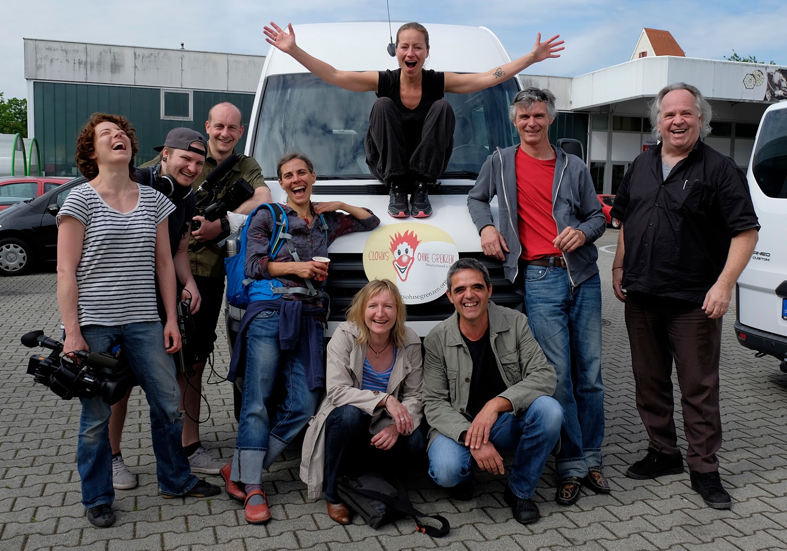 Zusammentreffen von Clowns- und Filmteam in Garching.