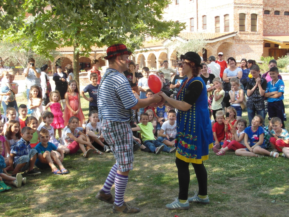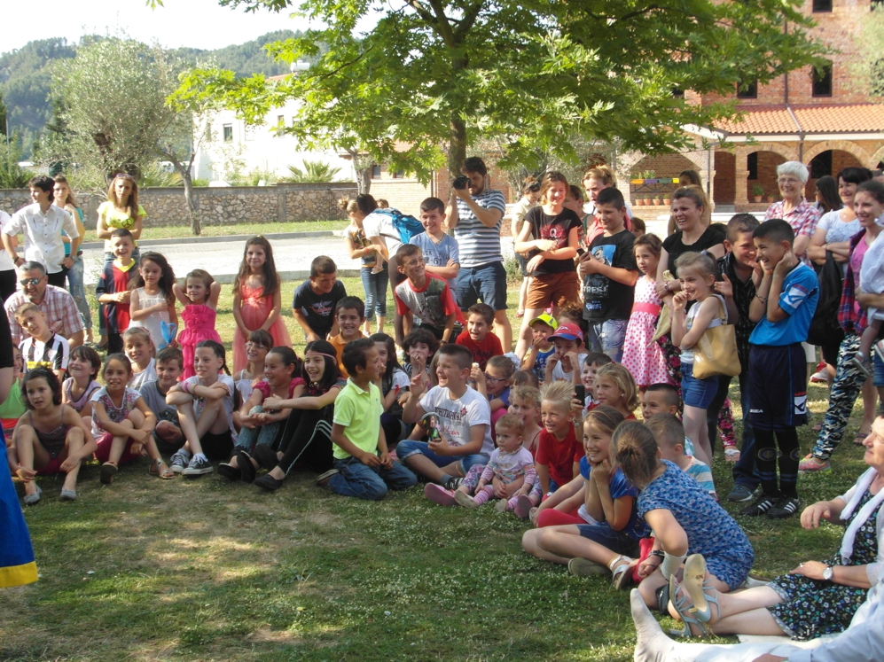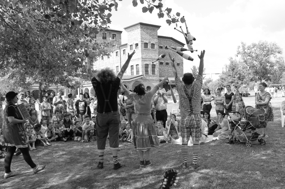 Uns wurde ein angenehm kühler Versammlungsraum im Untergeschoss des imposanten Gebäudes als Auftrittsmöglichkeit angeboten. Wir entschieden uns jedoch lieber im Schatten einer großen Birke zu spielen. Pünktlich zu Showbeginn wurde auch ein Fußballspiel angepfiffen. So hatten wir hauptsächlich Kinder und Frauen als Publikum.